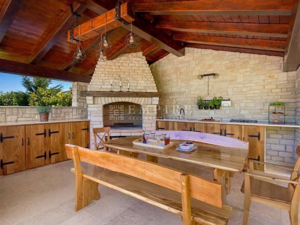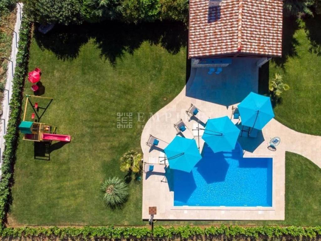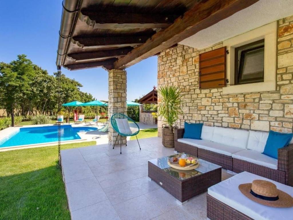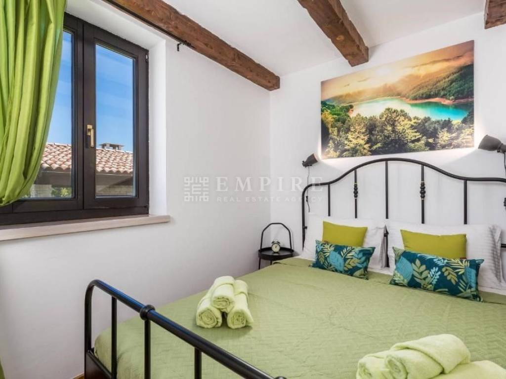 On a 1020 m² plot, this beautiful traditional villa offers 159 m² of living space. The ground floor features a fully equipped kitchen, dining room, comfortable living room, a fitness room with sauna and shower, bathroom, bedroom, and laundry. The first floor includes two spacious bedrooms and a bathroom with a jacuzzi. Heating and cooling are provided by air conditioning in each room, a pellet stove in the living area, and underfloor heating in all bathrooms, making it comfortable year-round. The spacious yard is fully fenced, with an alarm system installed. The irrigation system ensures lush greenery, and there is an outdoor kitchen with a large dining table, perfect for summer gatherings with a view of the pool and surrounding greenery. The 34 m² pool blends seamlessly with the property, offering privacy and tranquility. This high-quality property is located in central Istria, close to all necessary amenities. It is currently used for tourist rentals, generating excellent income for the owner year-round.