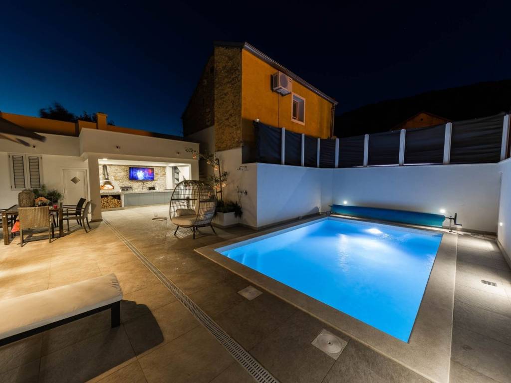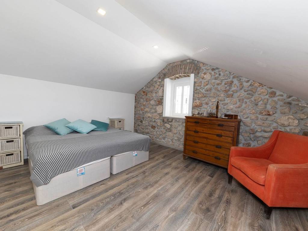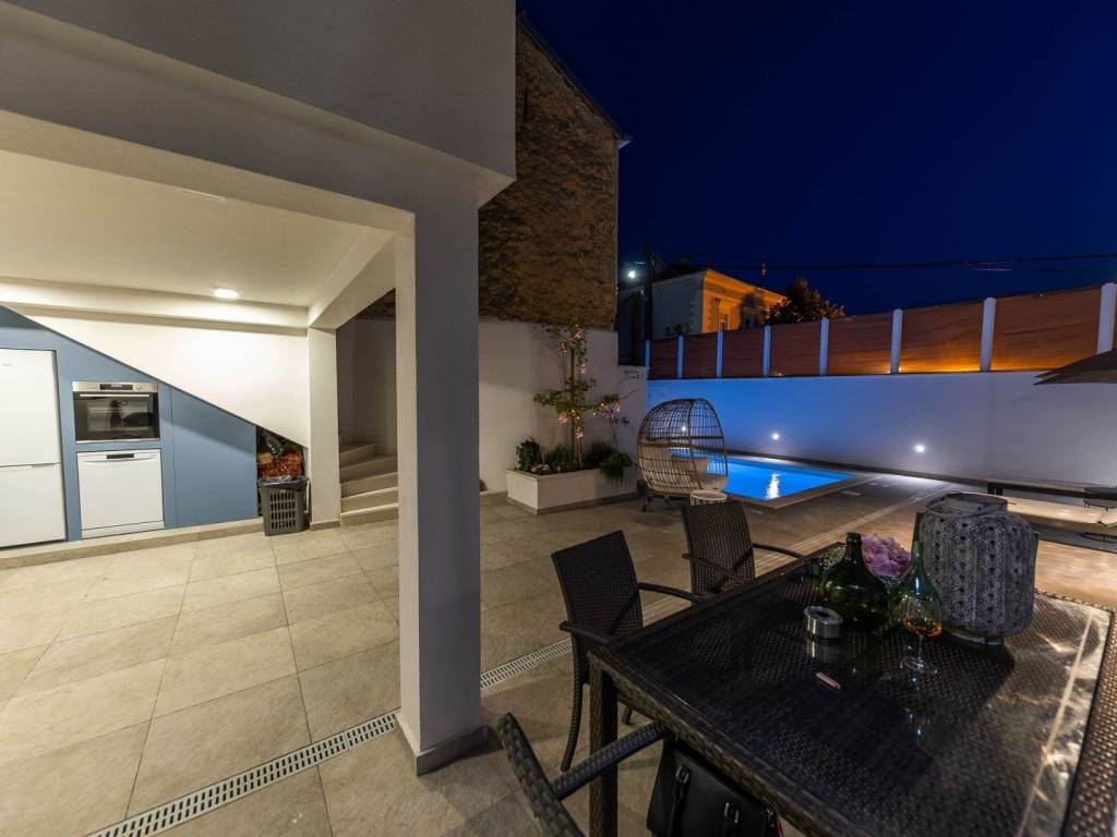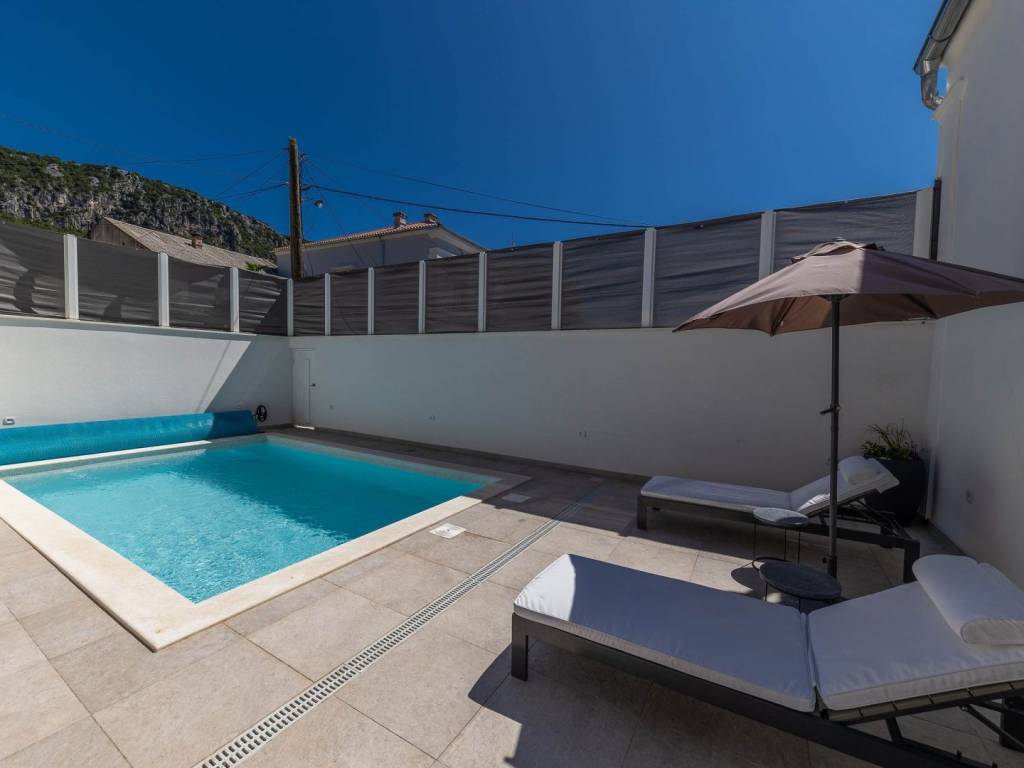 BRIBIR - Three-story villa with a pool and a view of the sea. A villa built at the beginning of the 20th century, completely renovated and modernly equipped, is for sale. It consists of three floors - ground floor, first floor and high attic. On the ground floor there is a living room, a kitchen with a dining room, a study with its own bathroom, a toilet and a storage room. In the central part of the ground floor there is a staircase that leads up to the first floor and the courtyard. On the first floor there are three bedrooms with separate bathrooms, and the master bedroom has a walk-in closet. In the yard we have a swimming pool with a sunbed, and above the summer kitchen with a bread oven there is an additional terrace. The yard is fenced and hidden from view. From the first floor, we climb the stairs to the high attic where there are two bedrooms and one bathroom. The villa also has its own garage and it is possible to park in the public area in front of and around it. The property is located in the old center, surrounded by the historical heritage of Vinodol, with a view of the sea and the old town. All amenities are within 300 meters. The location is ideal for living or vacationing and has potential for tourist rental.