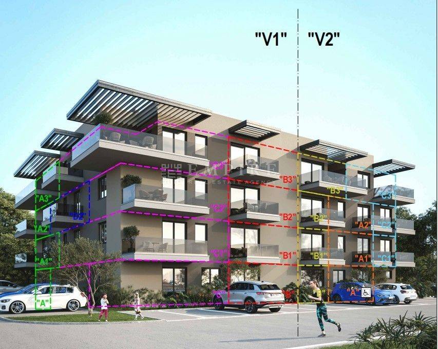 The new building with an elevator is located in an attractive area, close to all essential amenities, just a 10-minute drive from Poreč.