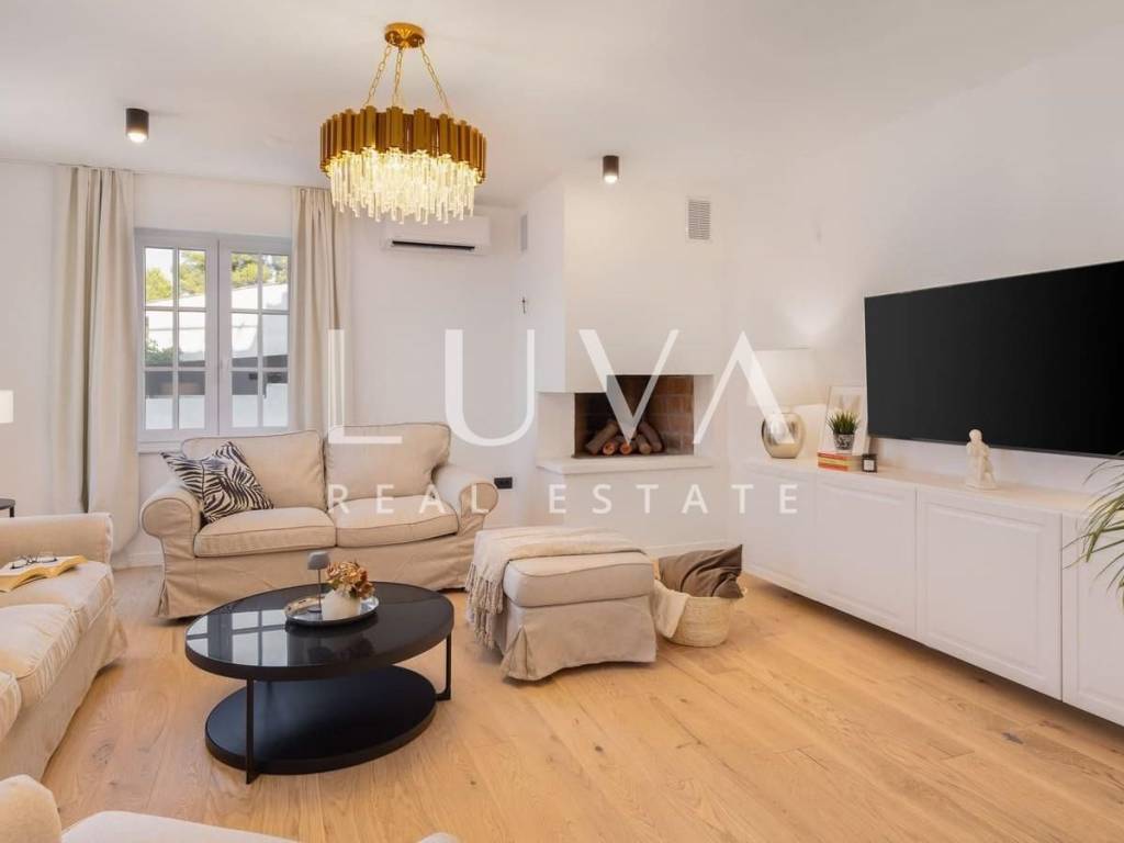 The villa has four spacious bedrooms, each with its own bathroom, and the entire space is air-conditioned to ensure a pleasant stay throughout the year. On the ground floor there is an open-plan living area with a modern kitchen and dining room, while the outdoor part of the property offers a heated swimming pool for enjoyment in all seasons. There is also parking with a capacity for five cars.