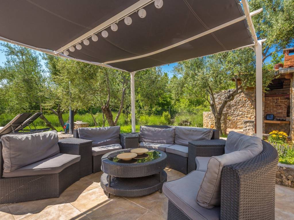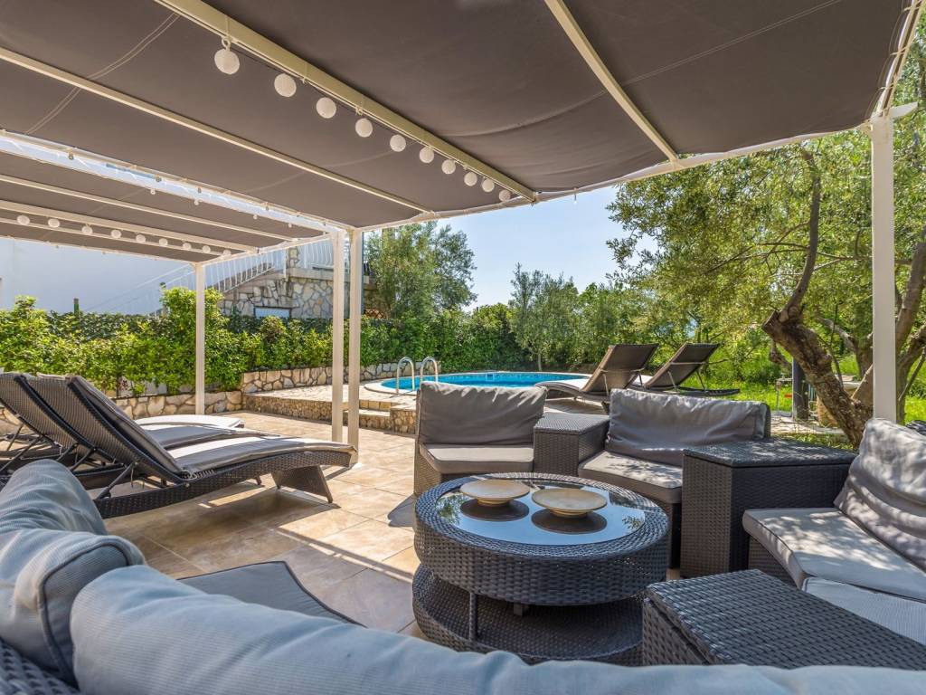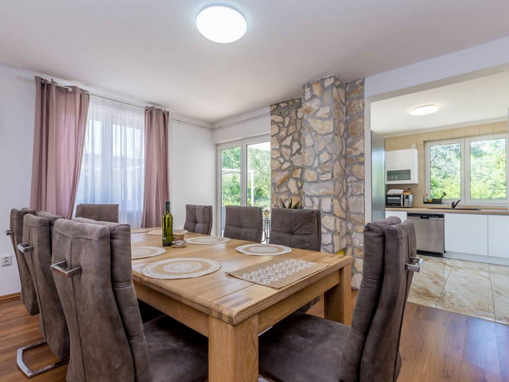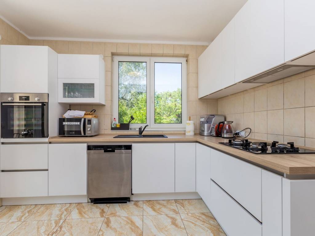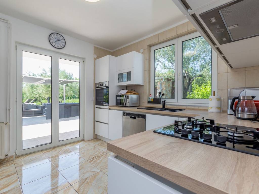 In a quiet and green location near the town of Krk, this detached family house with a living area of 200 m² is located, which with its amenities and layout provides an ideal space for a comfortable and functional life. The 440 m² garden is carefully landscaped, with a swimming pool, sundeck, outdoor shower, covered barbecue and storage room, and a small olive grove - a symbol of Mediterranean tradition and longevity, which creates an authentic atmosphere - is of particular value. The ground floor of the house consists of a hallway, a modern bathroom with shower and toilet, and a kitchen with a dining room. The ground floor provides access to the basement, which houses an entertainment room and storage space. There are two bedrooms on the first half-floor, while on the first floor there is another bedroom, living room, bathroom and balcony. The second half-floor includes two additional bedrooms. One of the balconies offers a sea view, although not panoramic, which still gives the space a dose of Mediterranean atmosphere. The house is equipped with gas central heating, which allows for a pleasant stay throughout the year. Parking for three cars is provided in the yard, which completes the practical aspect of this property. Thanks to its quiet location, well-designed layout and elements of local tradition, this house offers a pleasant living space near the sea - a harmony of nature and functionality.