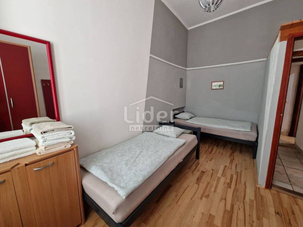 An apartment is for sale in the old part of the town of Rab in one of the streets that connect Srednja and Gornja streets. It is located on the ground floor, but not on the street side, so it has peace and privacy. It consists of a kitchen, dining room and living room as a whole, as well as two bedrooms and a bathroom. One bedroom opens onto a balcony of approx. 6 m2. The city beach and the park are close to the apartment, as well as all other city facilities.