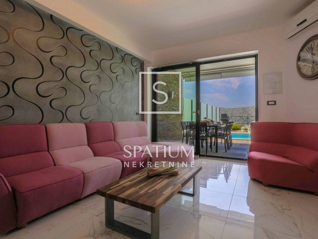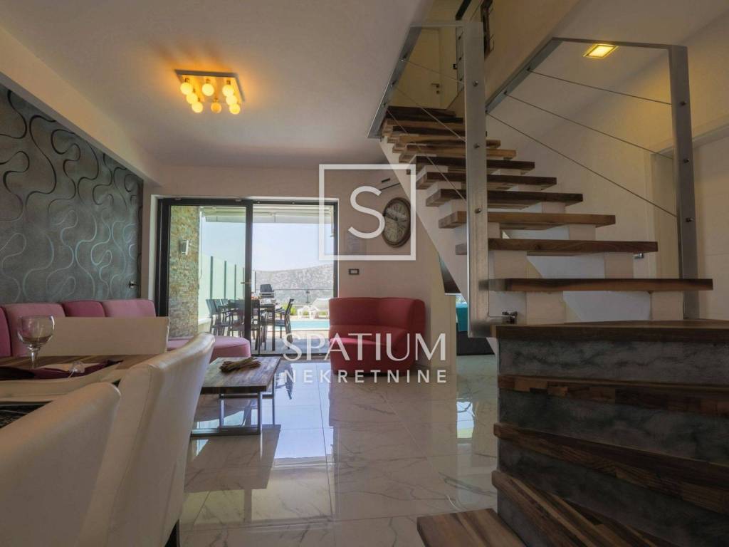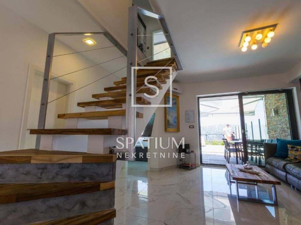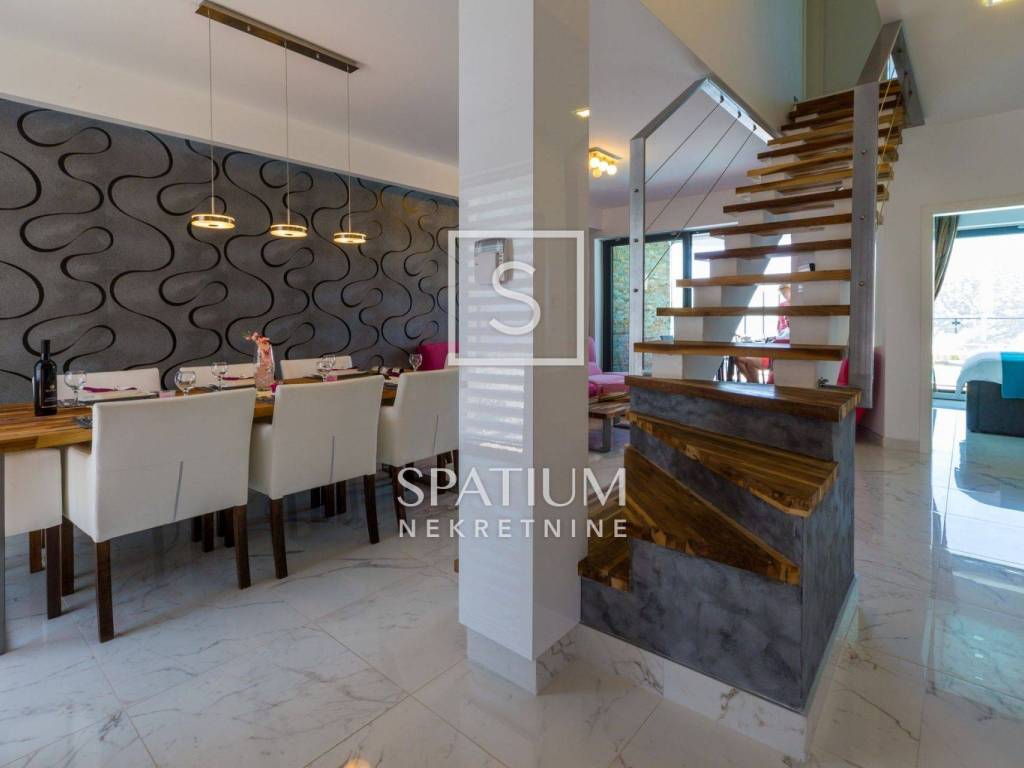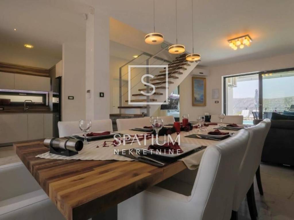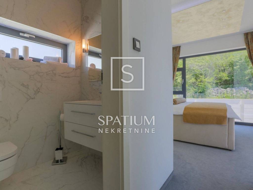 GRIŽANE, We are offering a unique urban villa in the hinterland of 220 m2. It contains two two-story apartments, each of them on the ground floor has a kitchen-dining area connected to a large living room from which there is access to a terrace with a swimming pool. There is also one bedroom and a bathroom on the ground floor. Each of the apartments on the first floor has three spacious bedrooms with their own bathrooms. Two rooms have balconies, while the third occupies a place outside the basic dimensions of the house, which gives it a spectacular view of the sea and the surrounding area. Each apartment also has a storage room and three parking spaces. The building is built of high-quality materials, the carpentry is of top quality, which guarantees durability and high energy efficiency. The quality of construction meets the highest standards of the profession. It has a modern design, with large glass surfaces. It is equipped with video surveillance and alarm systems, and exudes the luxury and comfort of a 602 m2 garden, and is located in the hinterland, only a ten-minute drive from the town of Crikvenica. The location and comfort of this villa provide an ideal place for a peaceful life, as well as for the purpose of tourist rental.