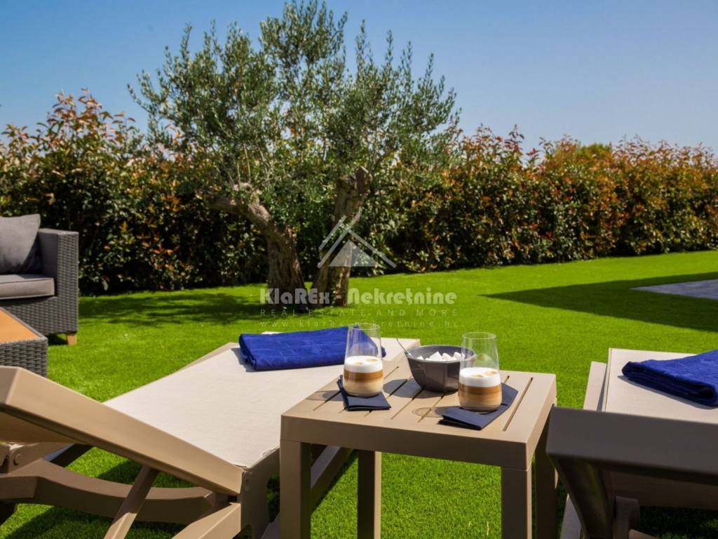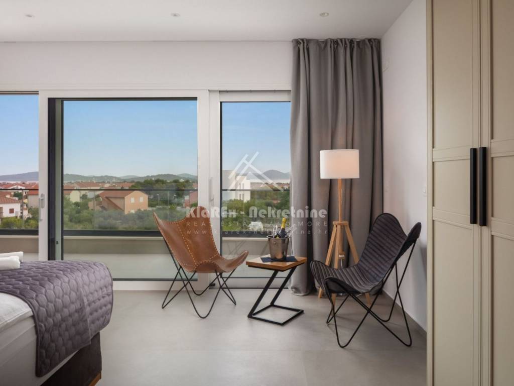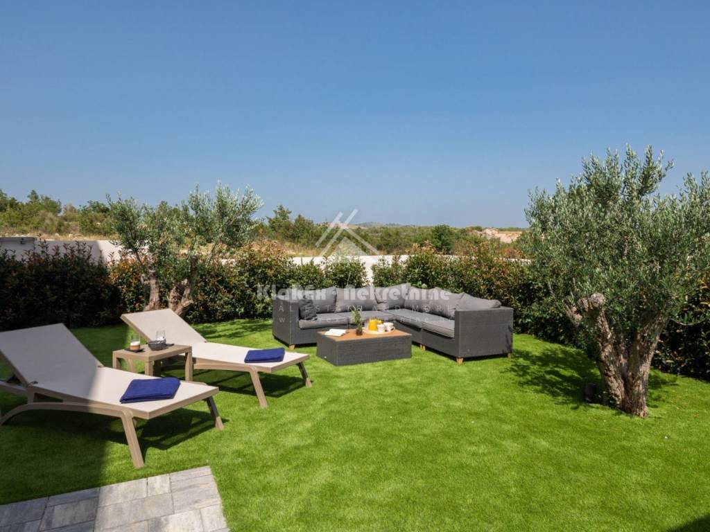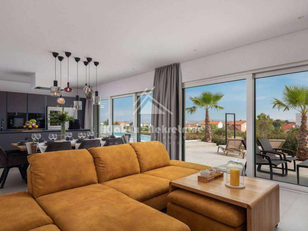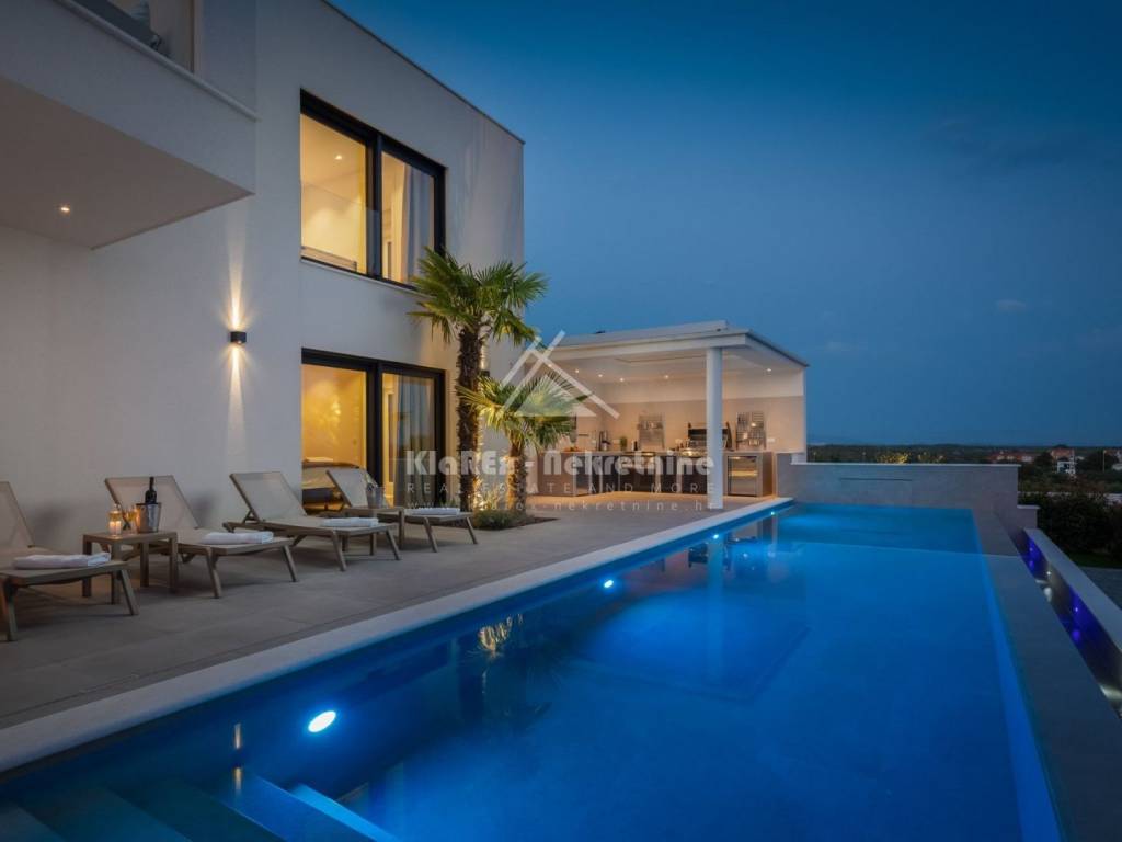 In Vodice, in an extremely quiet area, not far from the sea and the city center, a luxury villa with a swimming pool and sea view is for sale. The villa is about 1000 meters away from the center, or rather from the arranged beach. It has a net area of ​​320 m2, and was built in 2022 on a plot of land of 811 m2 and has three floors: basement, ground floor and first floor. The villa was built according to the most modern construction standards, in which extremely high-quality materials and equipment were used, of which we can highlight aluminum and PVC joinery, roller shutters with electric lifts, high-class ceramic tiles, stone-clad staircase, modern bathroom fixtures, underfloor heating, heat pump, 800-liter hot water boiler, electric car charging station, etc. The basement of the villa consists of a storage room, a machine room for the pool, and a bathroom. The ground floor, or the residential part, consists of an entrance, hallway, two bathrooms, two bedrooms, toilet, kitchen with dining room and living room with access to a spacious terrace and garden. Internal stairs lead to the first floor of the house, where there are three bedrooms, each with its own bathroom, and each with access to a spacious terrace with a beautiful view of the sea and the surrounding area. The house is decorated and furnished with modern and high-quality furniture, while the kitchen, for example, is equipped with quality appliances. The yard is completely decorated and consists of a large swimming pool of 48 m2, a sunbathing area and a beautiful summer kitchen, fully equipped with top-quality appliances for food preparation and barbecue. The house has parking for three cars and a garden decorated with Mediterranean plants. In addition to its own needs, the house is categorized as a holiday home and can be used for tourist exploitation. The ownership is clean, and the documentation is completely in order.