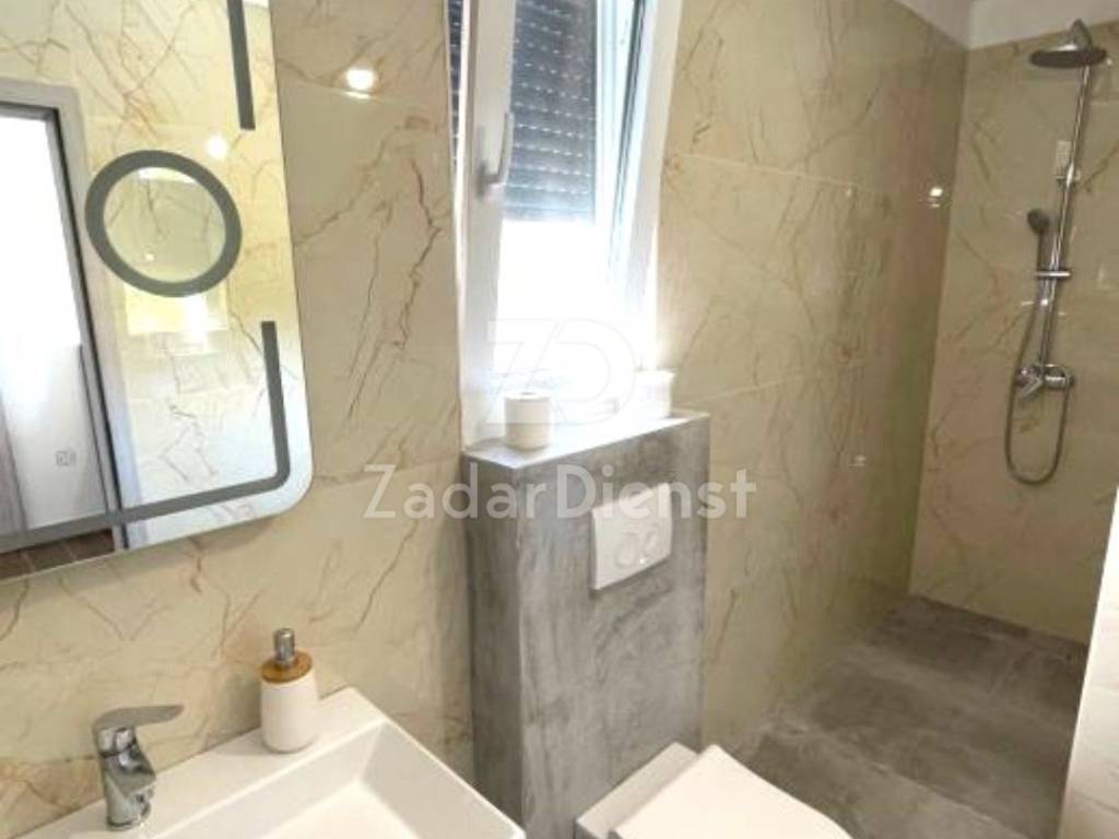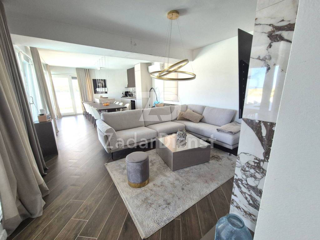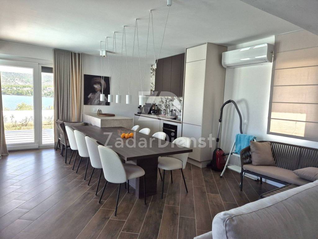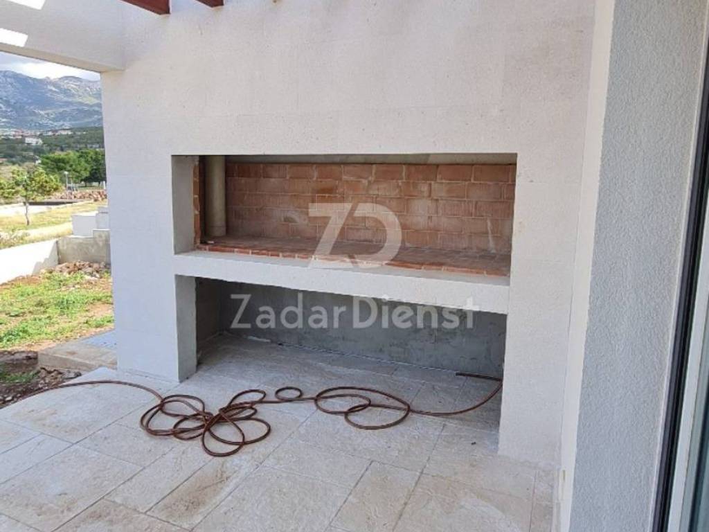 The net living area is 138 m2 and the gross area is 167 m2. The house consists of a ground floor and an upper floor. The ground floor consists of a living room, kitchen and dining room with an open concept with lots of natural light. The ground floor also has a hallway, one bathroom with shower and an office space that can certainly be used as an additional bedroom. The living room opens onto a spacious terrace with a stunning view of the sea and Velebit.
