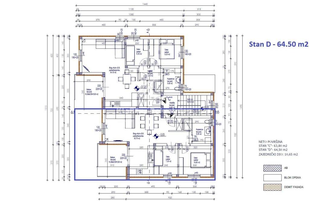Apartment D - two-bedroom apartment on the first floor of a residential building, living area 64.50 m/2. The apartment consists of: an entrance hall, a spacious living room with a kitchen and dining room, which leads to a 10 m2 terrace with a beautiful view of the sea and the surrounding area. Furthermore, the apartment has two bedrooms, a bathroom and two parking spaces.