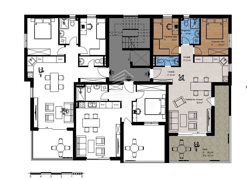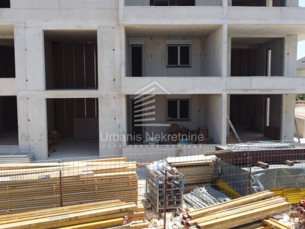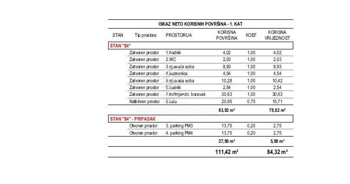 In the Crvene Kuće area of Zadar, a new part of the residential neighborhood is currently under development. A total of ten buildings are being constructed, with special attention given to quality, standards, and functionality. The neighborhood will feature its own park and playground. Apartment S4 is for sale and is located on the first floor of a building with an elevator. It has a total usable area of 84.32 m² and comes with two parking spaces. The layout of the apartment is well-organized and consists of: hallway, guest toilet, entrance area, two bedrooms, bathroom, kitchen with dining and living room, and a loggia.