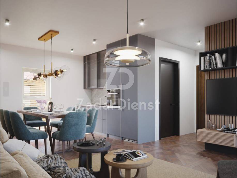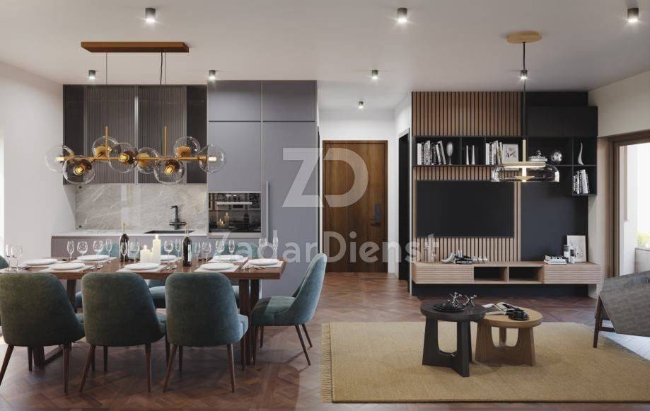 On the ground floor there is a 4-room apartment S2 consisting of a hallway/hallway, living room with kitchen and dining room, 3 bedrooms, 2 bathrooms (one bedroom has its own bathroom), terrace and garden. The apartment also has one parking space. The total net area of ​​the apartment is 91.70 m2 and is being sold at a price of 380,000 Euros.