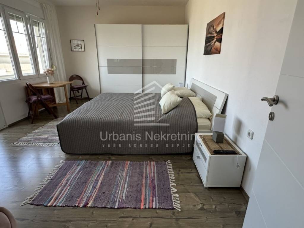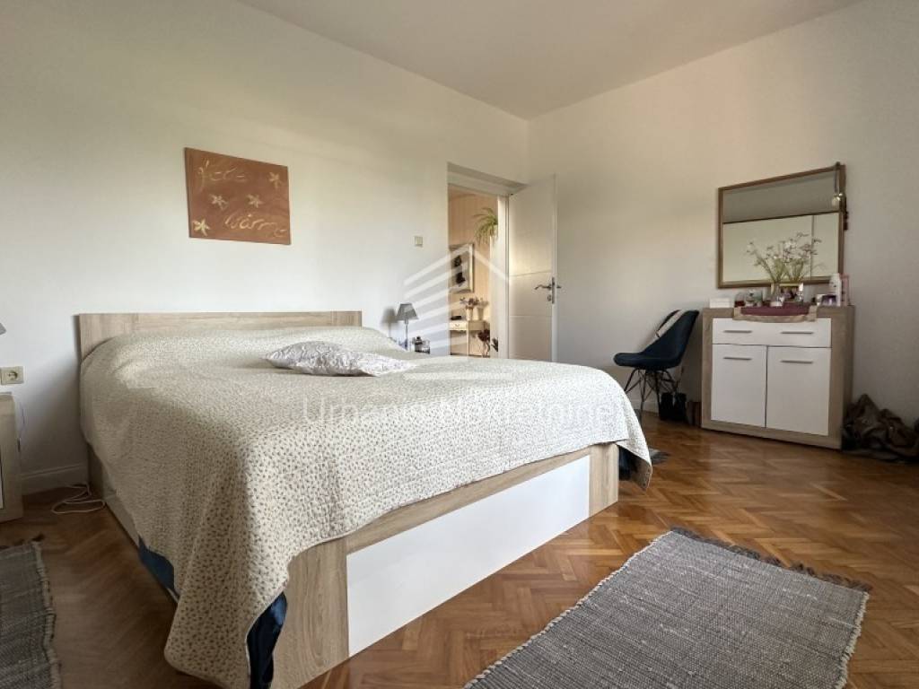 The upper floor with a surface of 153 sqm hosts the second residential unit with four bedrooms, a kitchen with a dining area, a living room, and two bathrooms. The south-facing bedrooms have access to a terrace with a sea view. The attic is partially finished and provides access to a large rooftop terrace.