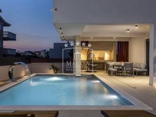 A beautiful luxury villa of 350m2 with a swimming pool and a roof terrace with a view of the sea. The villa is located on a plot of 466m2. It is separated from the main road, 190m away from the sea; it is located in a quiet area ideal for rest and relaxation.