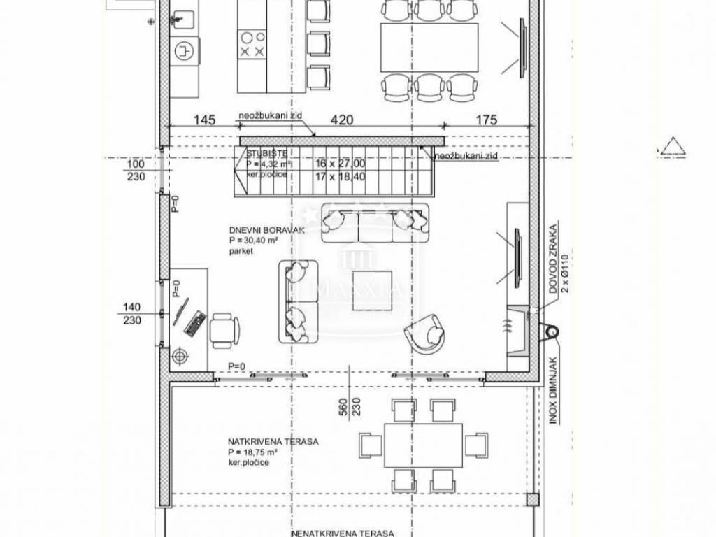 Floor: - large open space kitchen and dining room, - large living room with access to the terrace, - spacious covered terrace, - spacious uncovered terrace.