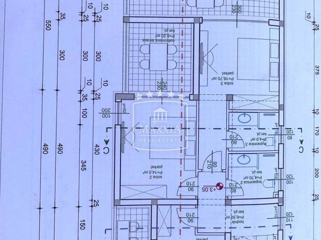 Roof terrace with electricity and water installations. Three parking spaces. Completion of construction works is scheduled for summer of 2024. For any additional information, feel free to contact us.