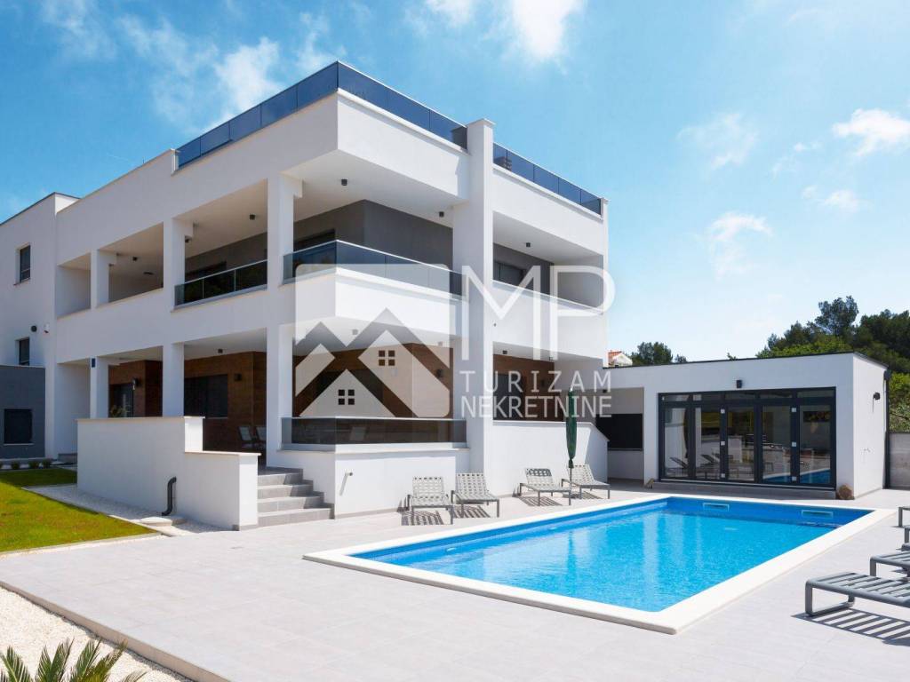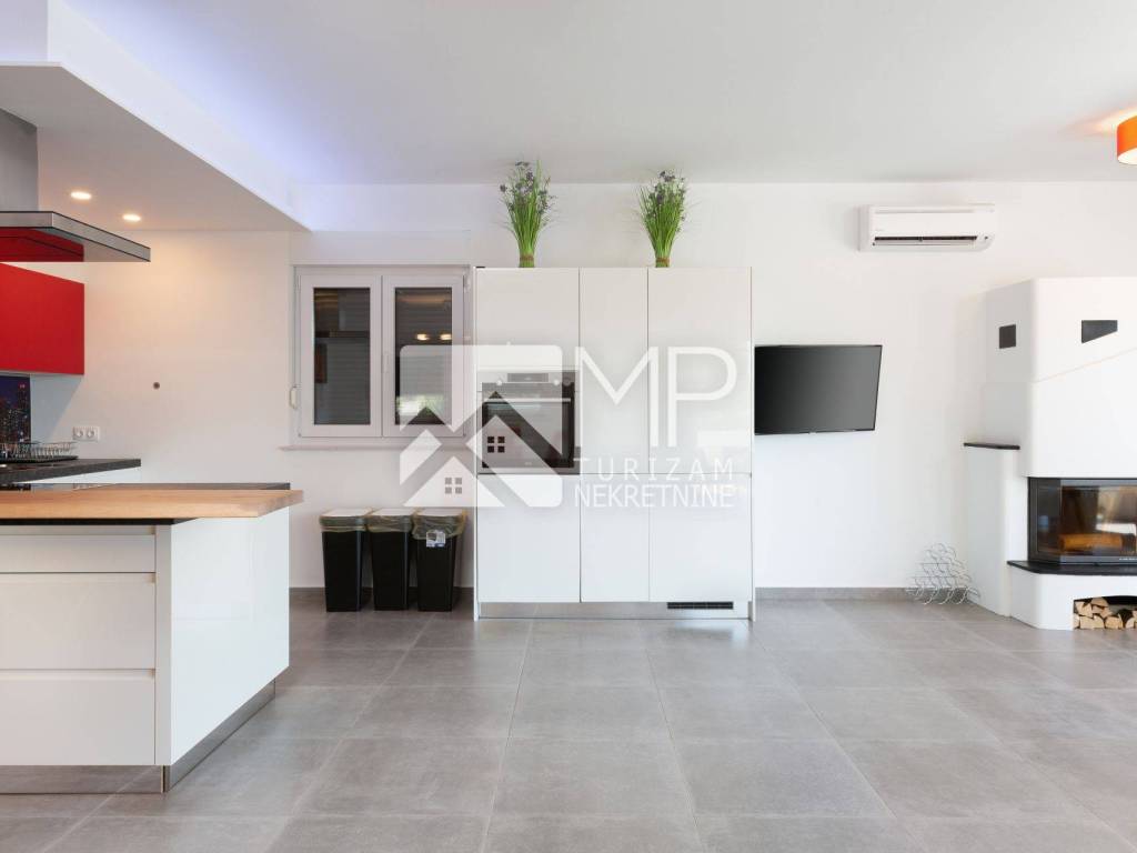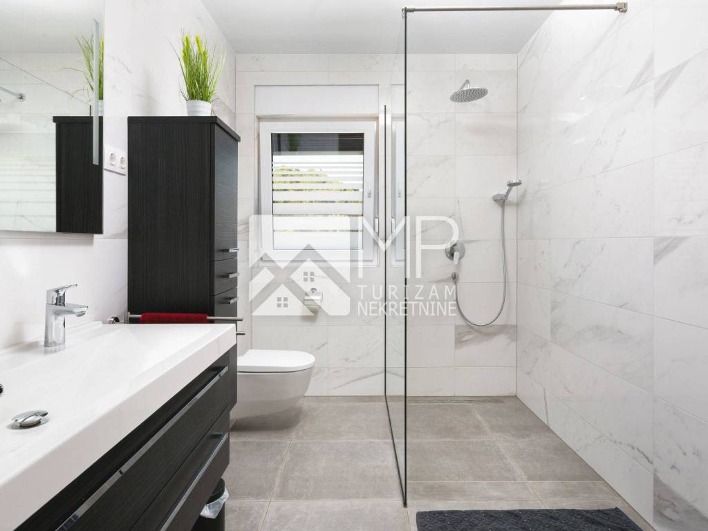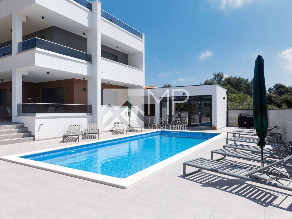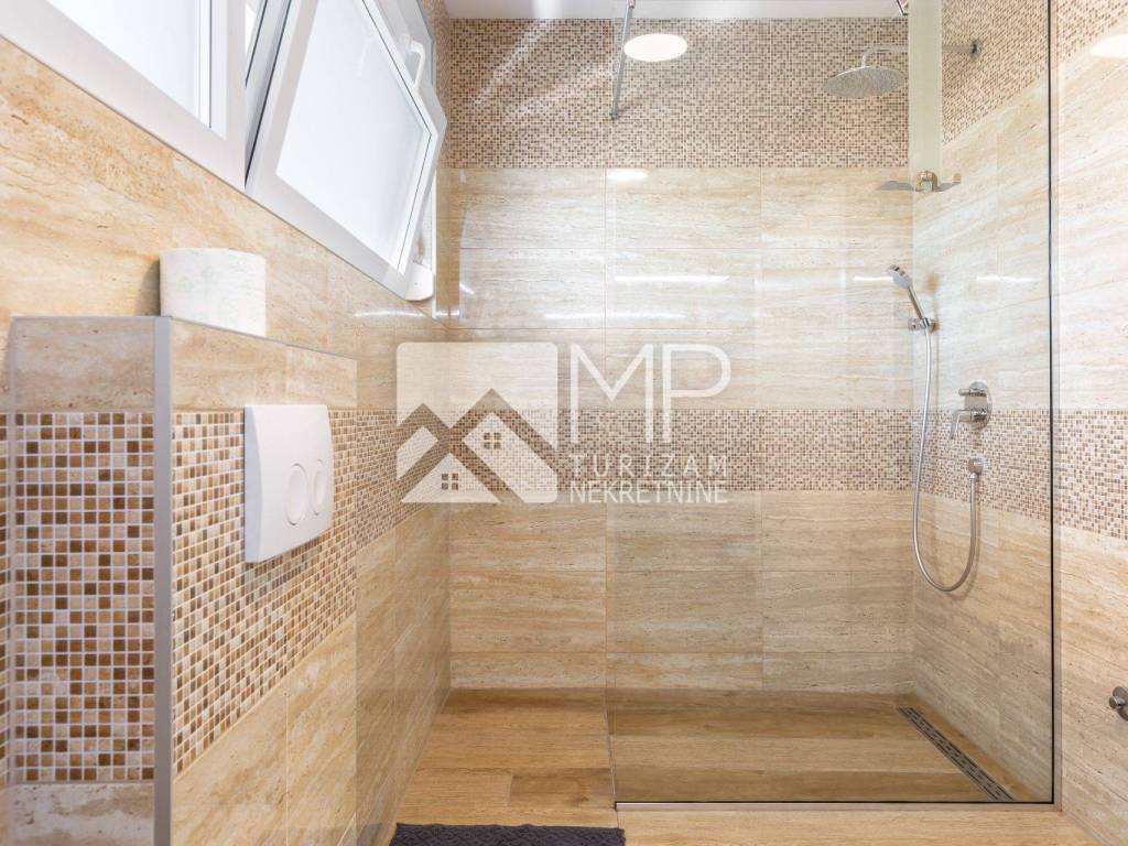 Medulin, one of the most visited and most famous places in Istria, and a popular tourist destination, also a favorite place to live. Located in a quiet part of the town, this villa ensures peace and privacy, and at the same time its amenities will not leave anyone indifferent. We are selling a new luxury villa with a total of 5 bedrooms and 4 bathrooms, with a beautiful balcony and views of the landscape, sea and pool. The villa was built in 2018-2019, located on a plot of 747m2. This beautiful villa consists of a ground floor, first and second floors, and the total area is 340 m2. The net area of the ground floor is 164.72 m2, and consists of: entrance porch and terrace, hallway with staircase, bedroom, bathroom, study, laundry room and large living room and kitchen. The ground floor has direct access to the heated pool of 45m2, and next to it is a tavern with a summer kitchen, table football and barbecue. The net area of the first floor is 132.64 m2, and consists of: staircase and hallway, 4 bedrooms, 3 bathrooms and a spacious balcony. Of particular note is the large roof terrace on the second floor, which has a breathtaking view of Medulin and the sea. The entire house is air-conditioned and has underfloor heating. There is parking for several cars on the well-maintained garden. The villa is categorized and is successfully rented, making it an excellent property for continuing an already established rental business. 1/1 ownership, no encumbrances!