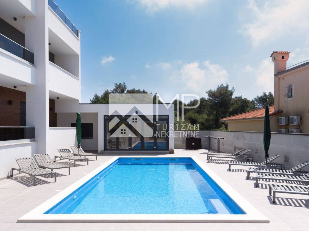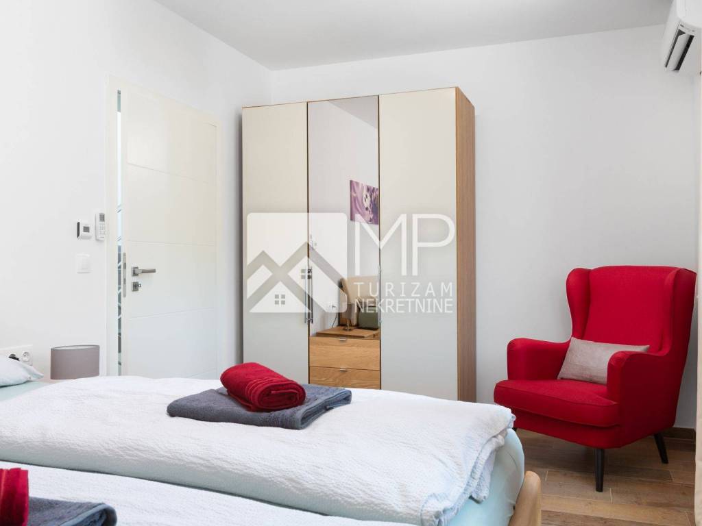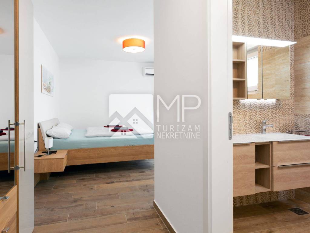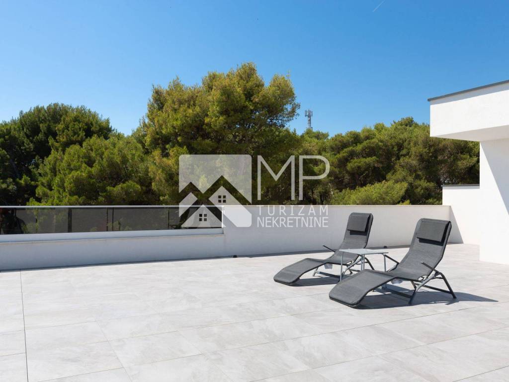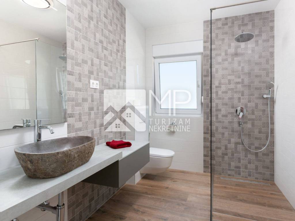 Medulin, one of the most visited and most famous places in Istria, and a popular tourist destination, also a favorite place to live. Located in a quiet part of the town, this villa ensures peace and privacy, and at the same time its amenities will not leave anyone indifferent. We are selling a new luxury villa with a total of 5 bedrooms and 4 bathrooms, with a beautiful balcony and views of the landscape, sea and pool. The villa was built in 2018-2019, located on a plot of 747m2. This beautiful villa consists of a ground floor, first and second floors, and the total area is 340 m2. The net area of the ground floor is 164.72 m2, and consists of: entrance porch and terrace, hallway with staircase, bedroom, bathroom, study, laundry room and large living room and kitchen. The ground floor has direct access to the heated pool of 45m2, and next to it is a tavern with a summer kitchen, table football and barbecue. The net area of the first floor is 132.64 m2, and consists of: staircase and hallway, 4 bedrooms, 3 bathrooms and a spacious balcony. Of particular note is the large roof terrace on the second floor, which has a breathtaking view of Medulin and the sea. The entire house is air-conditioned and has underfloor heating. There is parking for several cars on the well-maintained garden. The villa is categorized and is successfully rented, making it an excellent property for continuing an already established rental business. 1/1 ownership, no encumbrances!