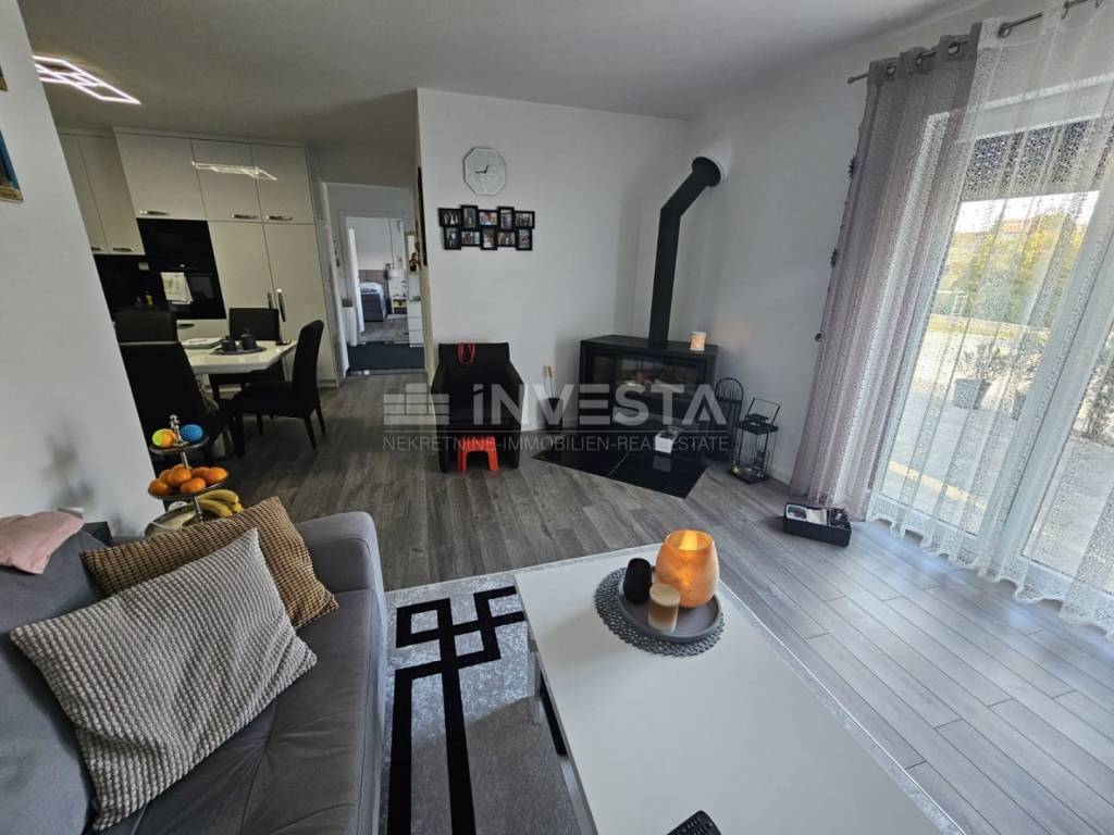 It consists of an entrance hall, two bedrooms, a bathroom, a guest toilet with technical equipment and a 600-liter water heater powered by solar panels and electricity, an elegant living room with a fireplace, a dining room, a kitchen, and a storage room.