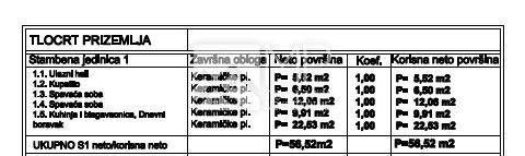 The apartment in question marked "S1" with an area of 56.52 m2 is located on the ground floor of the building, and consists of: entrance hall, kitchen and dining room with living room, two bedrooms, bathroom and part of the yard of approximately 37 m2.
