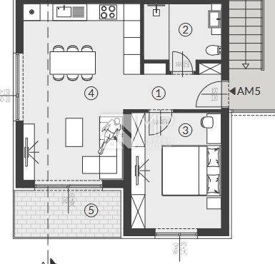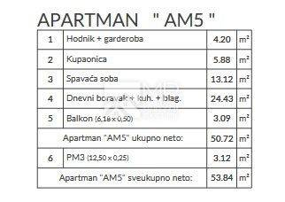 The apartment marked "AM5" consists of: hallway + wardrobe, bathroom, one bedroom, living room with kitchen and dining room with access to the balcony. The apartment has one parking space marked PM3. The total net square footage of the apartment is 53.84 m2.