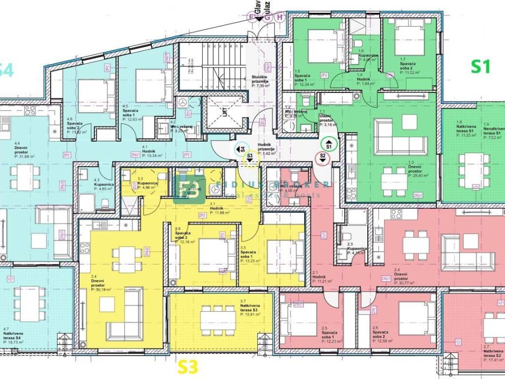 Apartment S2 is located on the ground floor of the building, oriented to the south. It consists of an entrance hall, toilet/laundry room, bedroom 1, bedroom 2, hallway, bathroom, kitchen with dining room and living area with access to a spacious covered terrace of 17.41 m2 from which you can access the part of the garden/yard that belongs to this apartment. The apartment has a corresponding part of the garden, a storage room in the basement and one parking space. The total usable area is 84.25 m2. The price is: €345,425 (VAT included - the buyer is exempt from paying 3% real estate tax).