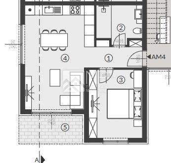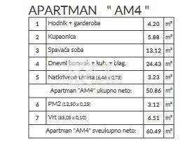 The apartment marked "AM4" consists of: hallway + wardrobe, bathroom, one bedroom, living room with kitchen and dining room with access to a covered terrace. The apartment has one parking space marked PM1 as well as a part of the garden of 65m2.