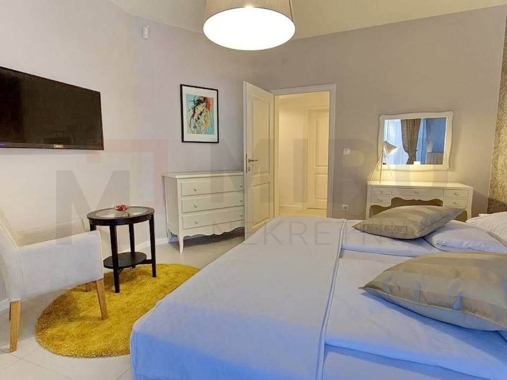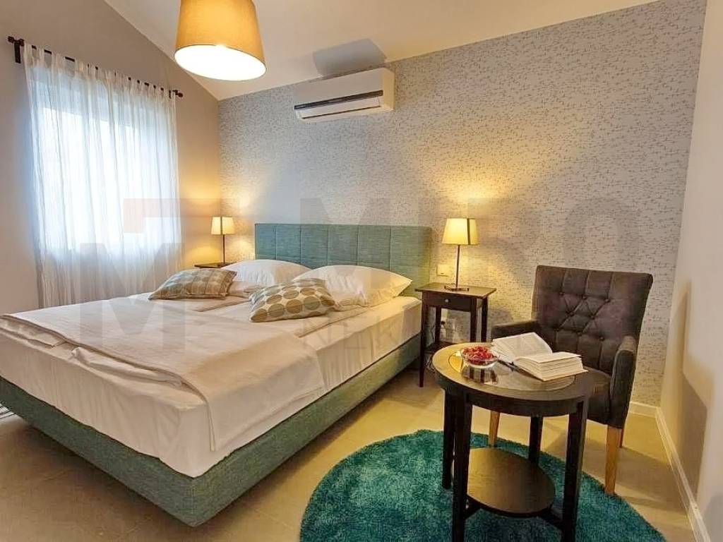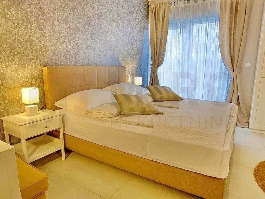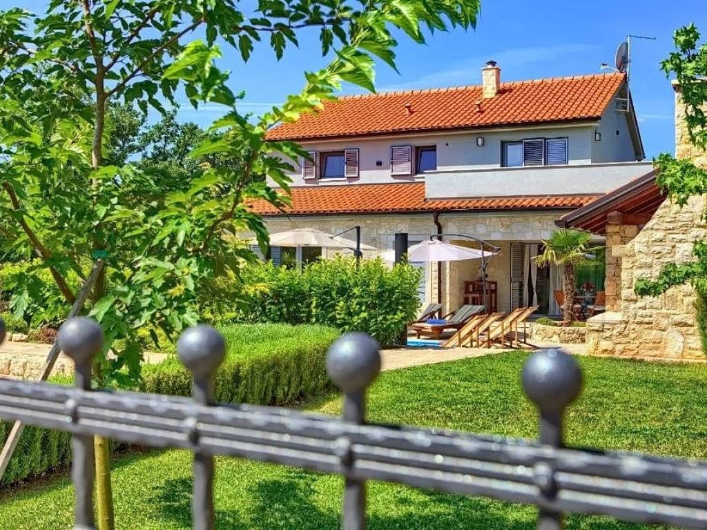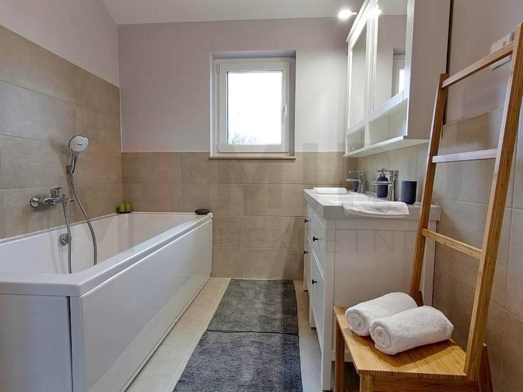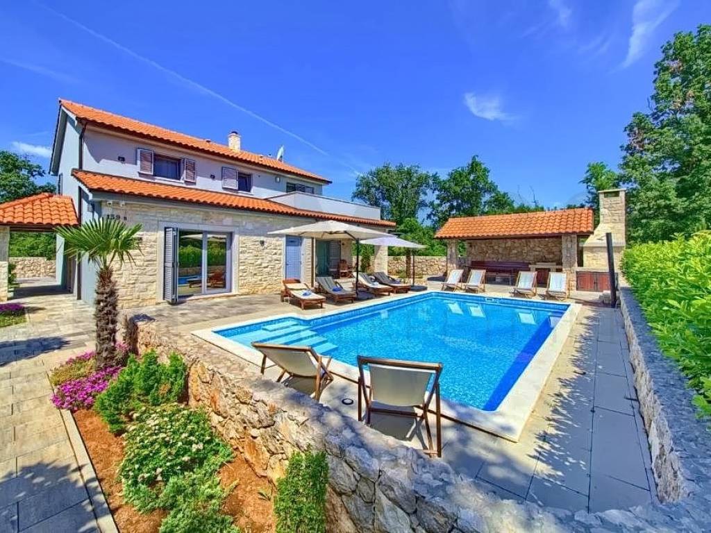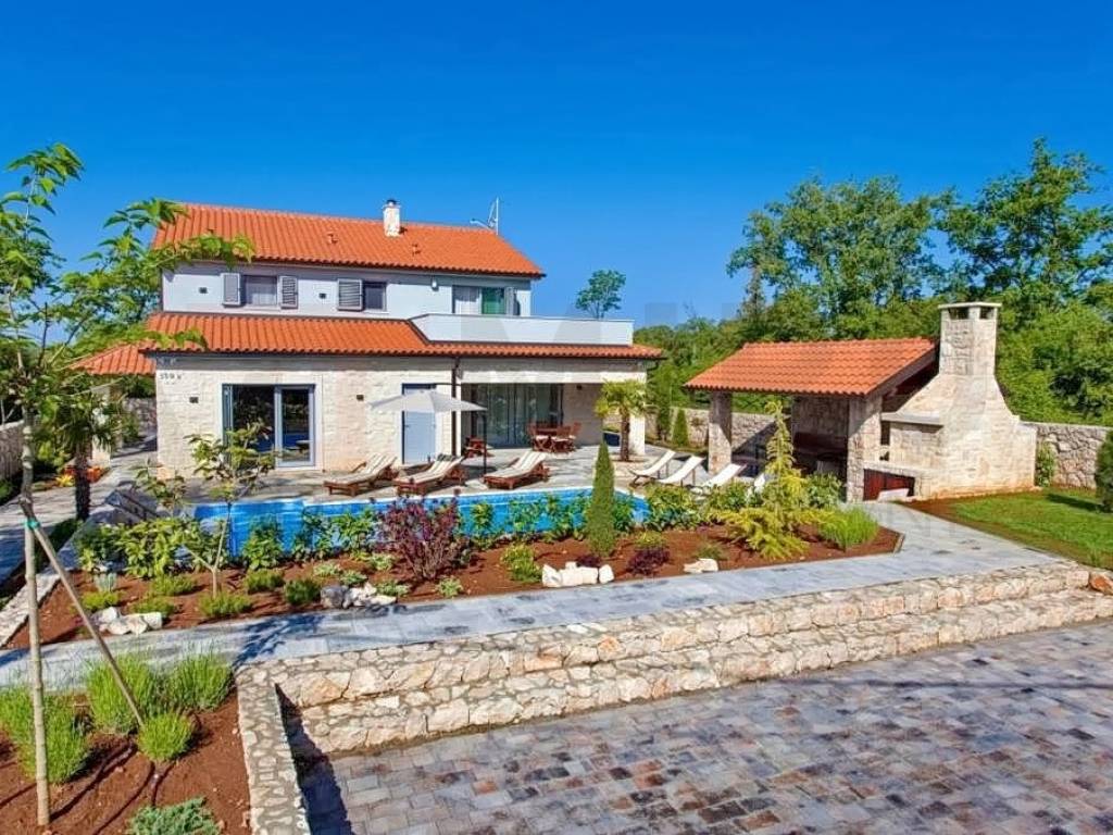 The island of Krk, Dobrinj area, for sale is a detached luxury villa in a quiet location on the edge of the green zone. The total area of the property is 185 m2. The ground floor of the villa consists of a hallway, a laundry room, a storage room, one bedroom, a bathroom and a spacious open space that includes a kitchen, dining room and living room. From this area you can go out to the covered terrace and enjoy the beautiful view of the pool and garden. Also, on the ground floor there is a wellness area equipped with a shower, bathtub and Finnish sauna. There are three bedrooms on the first floor, where each room has a TV, and one of the rooms has an exit to the balcony. There are also two bathrooms upstairs, one of which belongs to the master bedroom and has a shower, while the other has a bathtub. The villa is surrounded by a spacious garden with a heated swimming pool, an outdoor fireplace, a barbecue, a summer kitchen, a jacuzzi and a children's playroom. The property is owned by a natural person. The seller guarantees clean ownership documentation of the house. Visit us and find the square footage of your home!