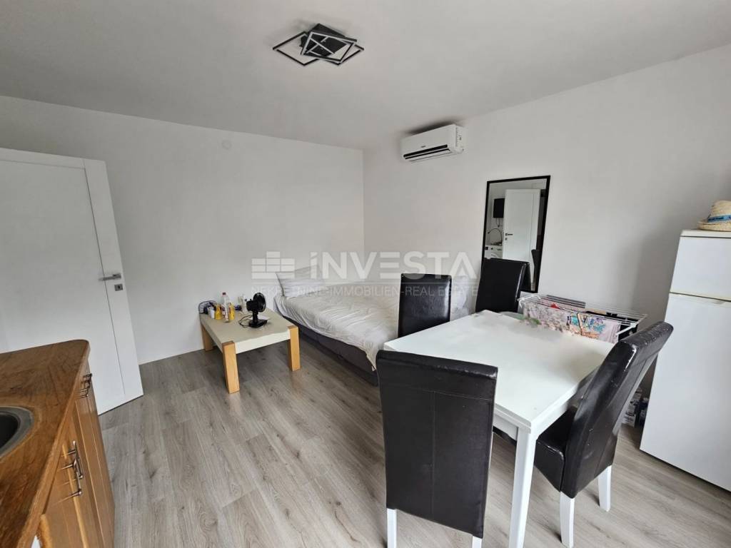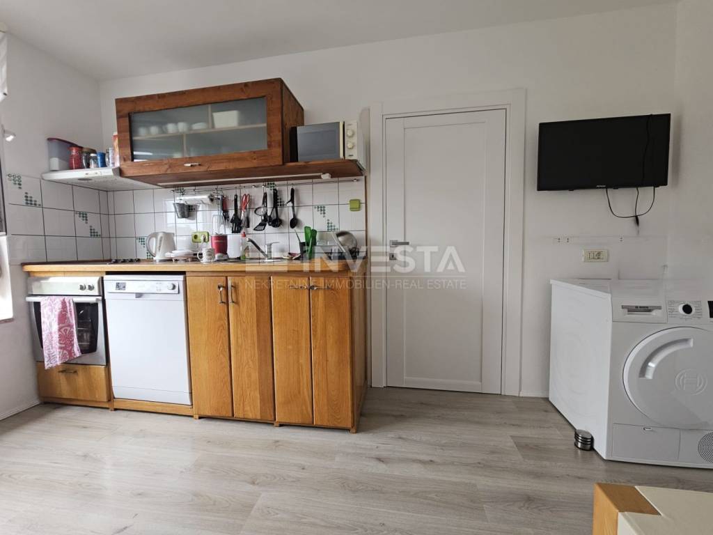 In the center of Fažana, just 150 m from the beautiful local beaches, this charming 32 m² apartment is for sale. It is located on the first floor of a residential building and consists of an entrance hall, a bathroom with a shower, one bedroom, and an open-plan living room with a kitchen and dining area. Heating/cooling is provided by an air-conditioning unit, and there is also the possibility of installing a solid-fuel stove since the building has a chimney. PVC joinery is installed. The apartment is sold fully furnished and equipped. A small storage room on the ground floor of the building also belongs to it.