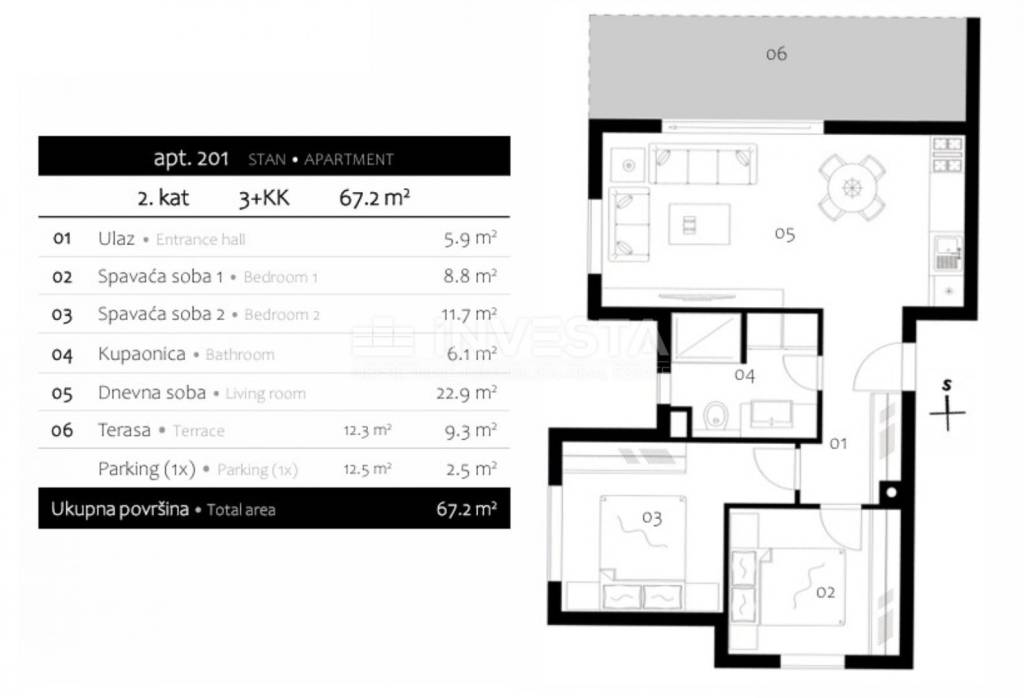 The apartment has a net usable area of 67 m², while the total floor area including the terrace and parking is 80 m². It consists of an entrance hallway, bathroom, storage room, open-plan living room with kitchen and dining area, access to a covered terrace of 12 m², and two bedrooms.