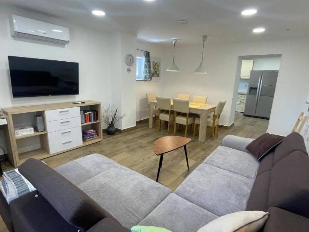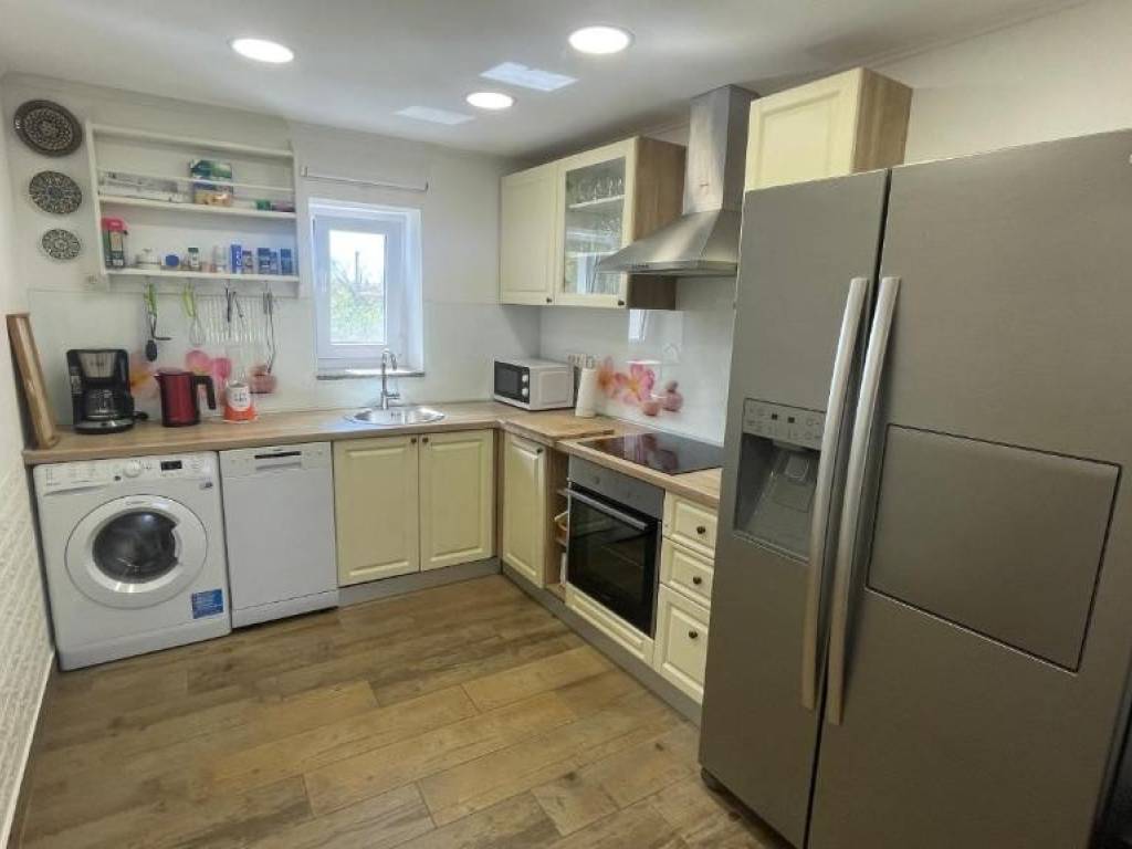 On the ground floor of the house there is an entrance hall, a bedroom with a bathroom, a living room with a dining room, a fully equipped kitchen with access to the yard where there is a covered summer kitchen and a swimming pool.