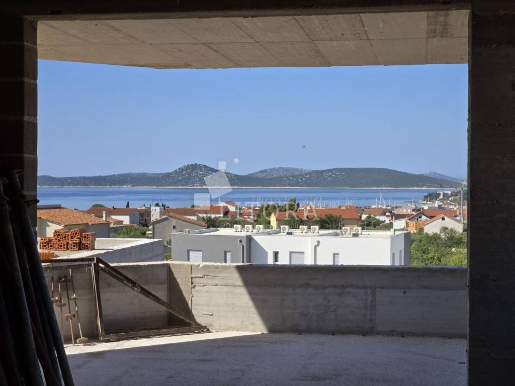 Vodice – Modern penthouse with a total usable area of 146,25 m² with panoramic sea view and a functional layout. The apartment consists of an entrance hall, laundry room, three bedrooms, two bathrooms, toilet and a spacious living room with a kitchen and dining area. From the living area, there is access to a covered and covered terrace with beautiful sea view. The apartment represents an ideal combination of modern design and comfort, offering everything needed for a high-quality stay or year-round living.The distance to the sea/beach is approximately 1.150 m, and to the town center about 950 m.