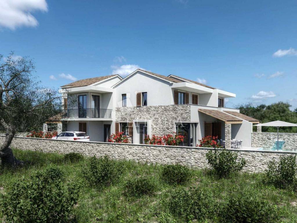 Jezera – Mediterranean-Style Family House in a Quiet Location with Swimming Pool. This beautiful family house is located in a peaceful area and features a Mediterranean design. It consists of two floors (ground floor and first floor), with a total usable area of 117.56 m². The property includes a spacious terrace/sunbathing area, an outdoor swimming pool of 23.36 m², and private parking. The ground floor comprises an entrance hall, bathroom, one bedroom, and an open-plan living room with a kitchen and dining area, which opens onto the terrace.