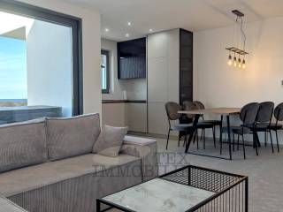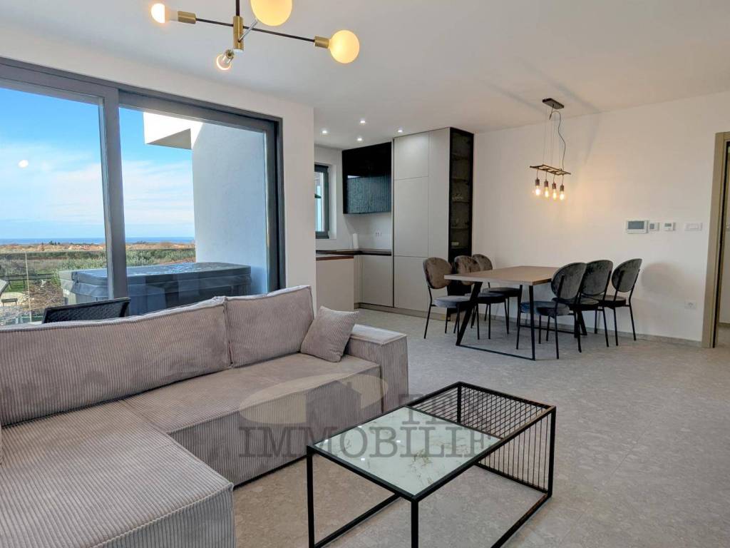 A brand new apartment for sale in a quiet village near Poreč, just 4 km from the sea. This apartment has a total area of 96.56 m2, including a 15.63 m2 terrace with a jacuzzi. It consists of a spacious living room with kitchen and dining area, hallway, bathroom, separate toilet and three bedrooms, including a master bedroom with an en suite bathroom. The apartment comes with a storage room of 7.51 m2 and a parking space. This new apartment represents an excellent opportunity to own a modern and comfortable living space in a quiet location near Poreč. With its spacious layout and proximity to the sea, it promises a pleasant lifestyle for its future owners.