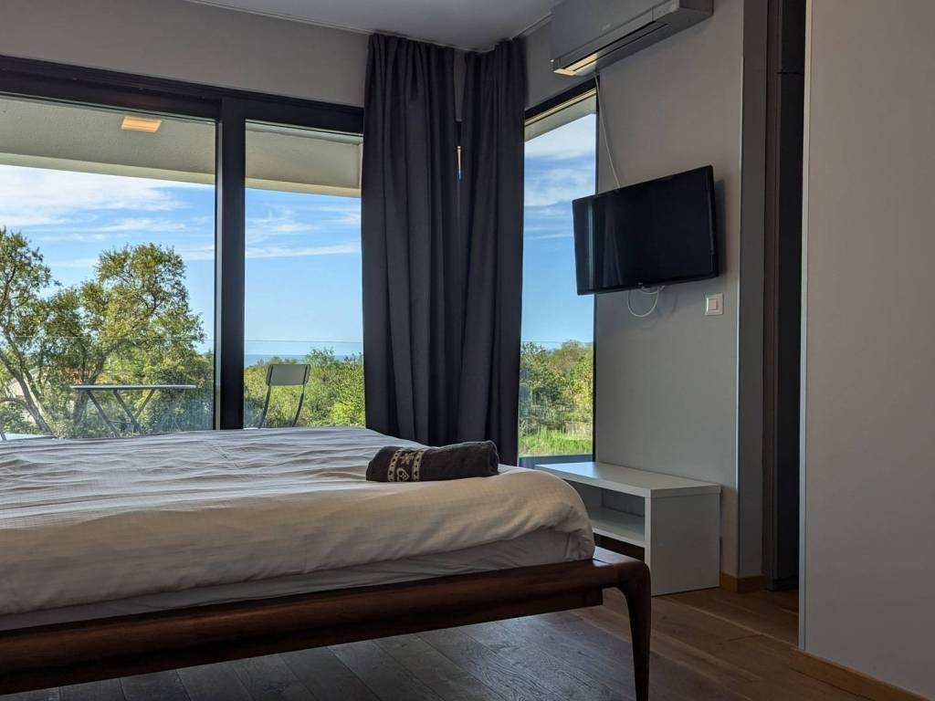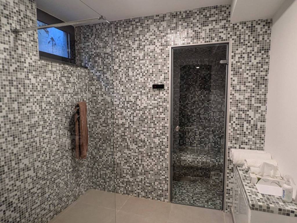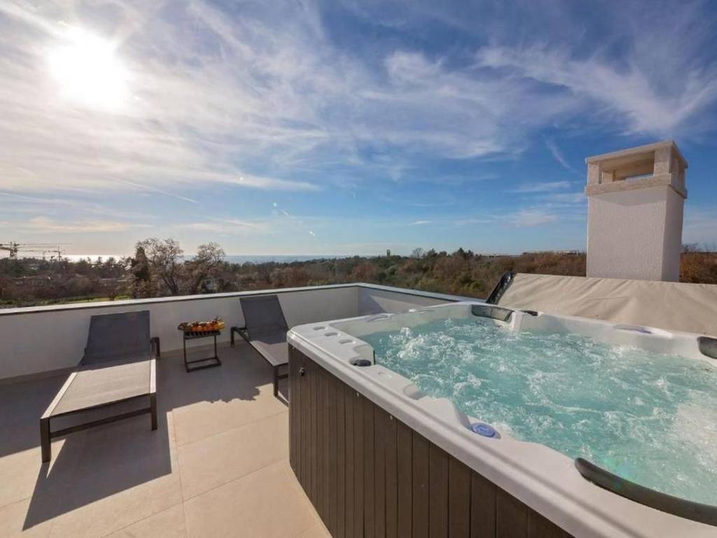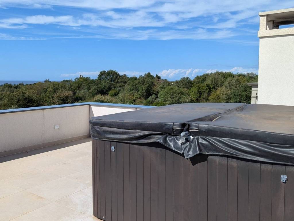 The outdoor area is enchanting, with a pool, a barbecue, a poolside terrace, a sunbathing area, and two covered terraces. A large rooftop terrace offers sea views and includes a jacuzzi and wellness amenities such as a sauna, shower cabin, and a well-equipped fitness area in the basement.