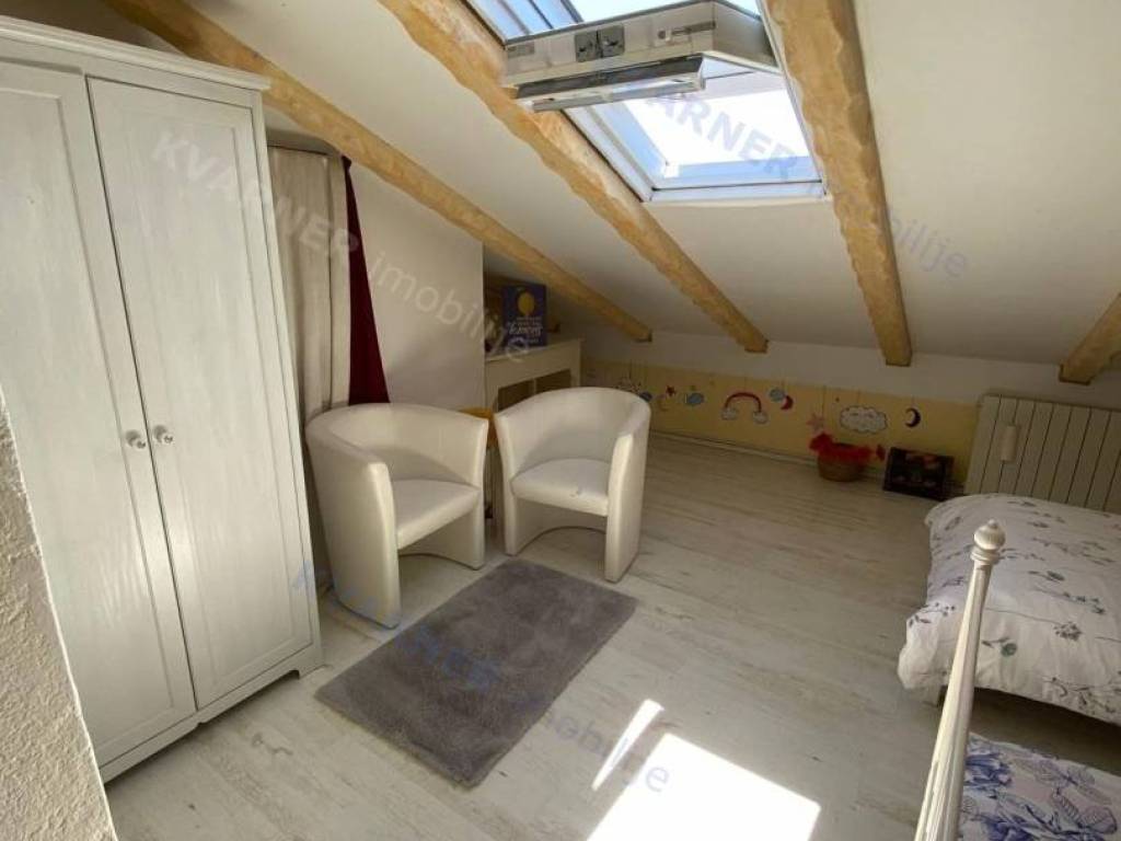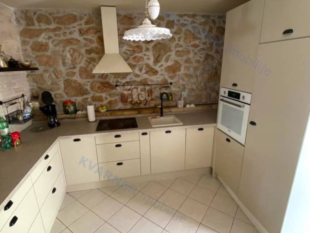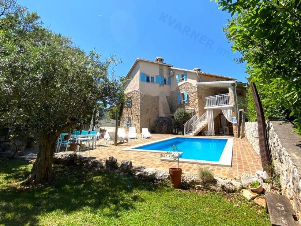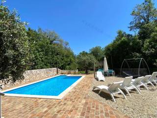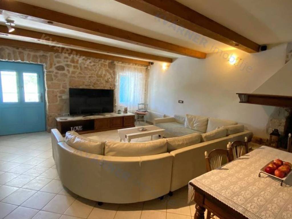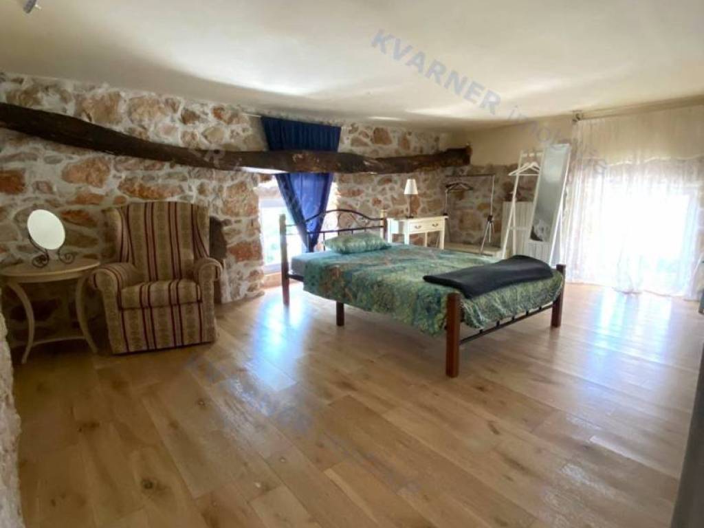 The house consists of a ground floor and an upper floor. On the ground floor, there is an original olive oil processing shower and a technical room for central heating, which can be arranged as a tavern for socializing, and a bathroom. External stairs lead to the living area, which consists of a living room with a kitchen and dining area, a bathroom, and one room (gallery) that is currently arranged as a bedroom but can also be used as an office. From the living area, there are two terraces. One terrace overlooks the pool with a sunbathing area and provides access to the garden, while the other terrace faces the other side of the garden. Internal stairs lead to the high attic where there are three bedrooms and one bathroom. The house is decorated in a rustic style and exudes a charm that many will appreciate. It is sold furnished and equipped, excluding personal items. It is equipped with a central heating system using pellets and wood, as well as air conditioning. The house has a beautiful large garden of approximately 1000 m², surrounded by greenery, with an olive grove and parking for several vehicles. The house is ideal for enjoying peace and quiet, and it can also be an excellent rental opportunity!