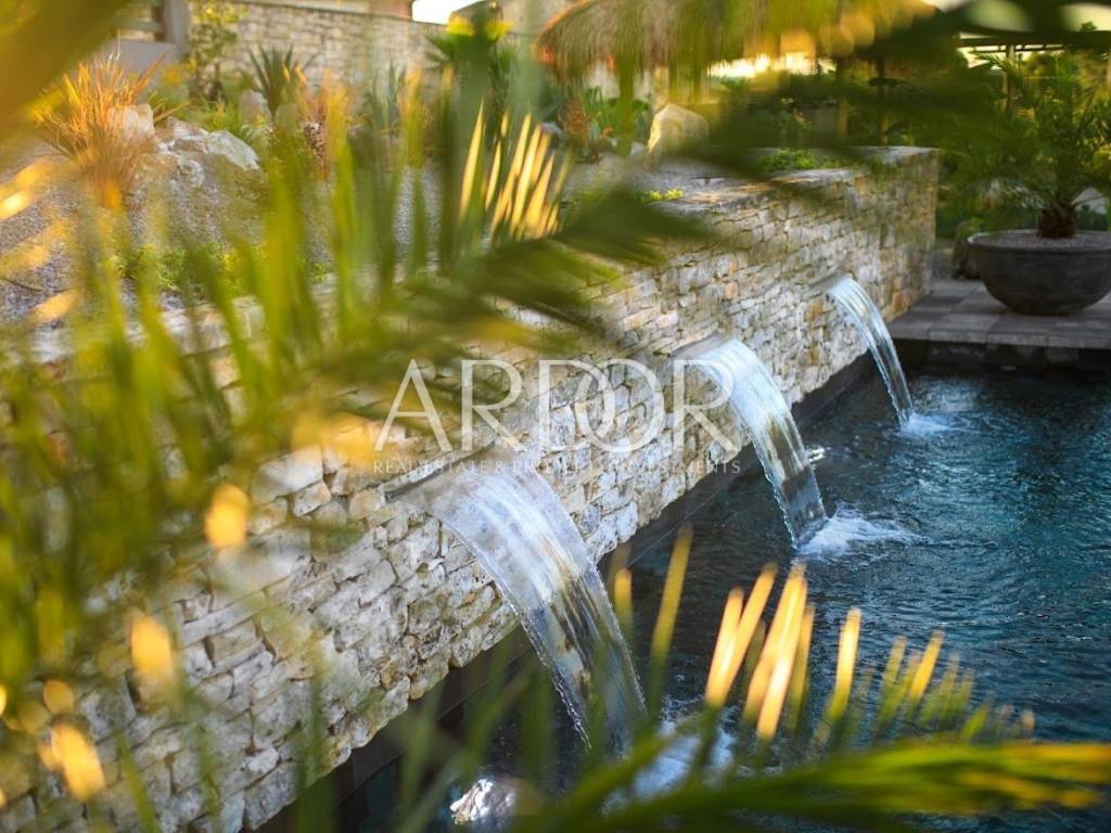 The garden of the villa, carefully designed and filled with a variety of plants, testifies to the care and attention that has been invested. It includes an impressive 32 m² illuminated pool made of volcanic stone with massage waterfalls, a large luxurious jacuzzi and a swing, which all contribute to the atmosphere of an exotic oasis.