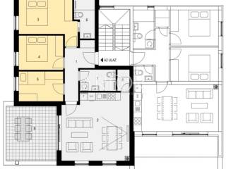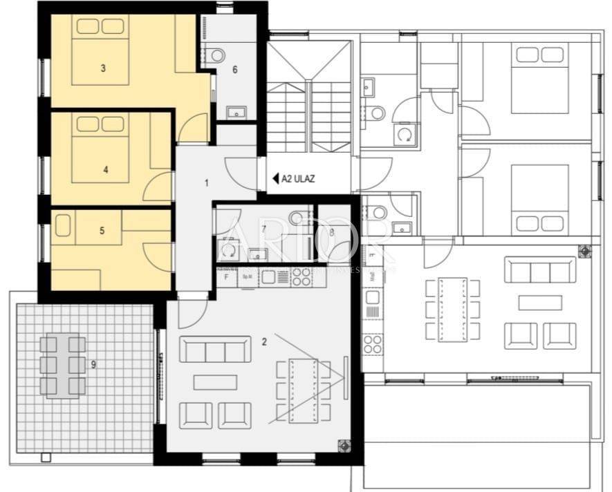Apartment A1 is located on the 1st floor and consists of: hallway, kitchen/dining room/living room, bedroom 1, bedroom 2, bedroom 3, bathroom 1, bathroom 2, storage room, covered terrace, parking space 1, parking space 2