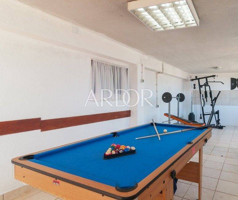 The ground floor contains a garage of about 80 m², which partially serves as a storage room, and an additional room with a view of the sea. The former summer kitchen has now been converted into a mini gym and recreation area, equipped for exercise and fun, with a pool table and darts.