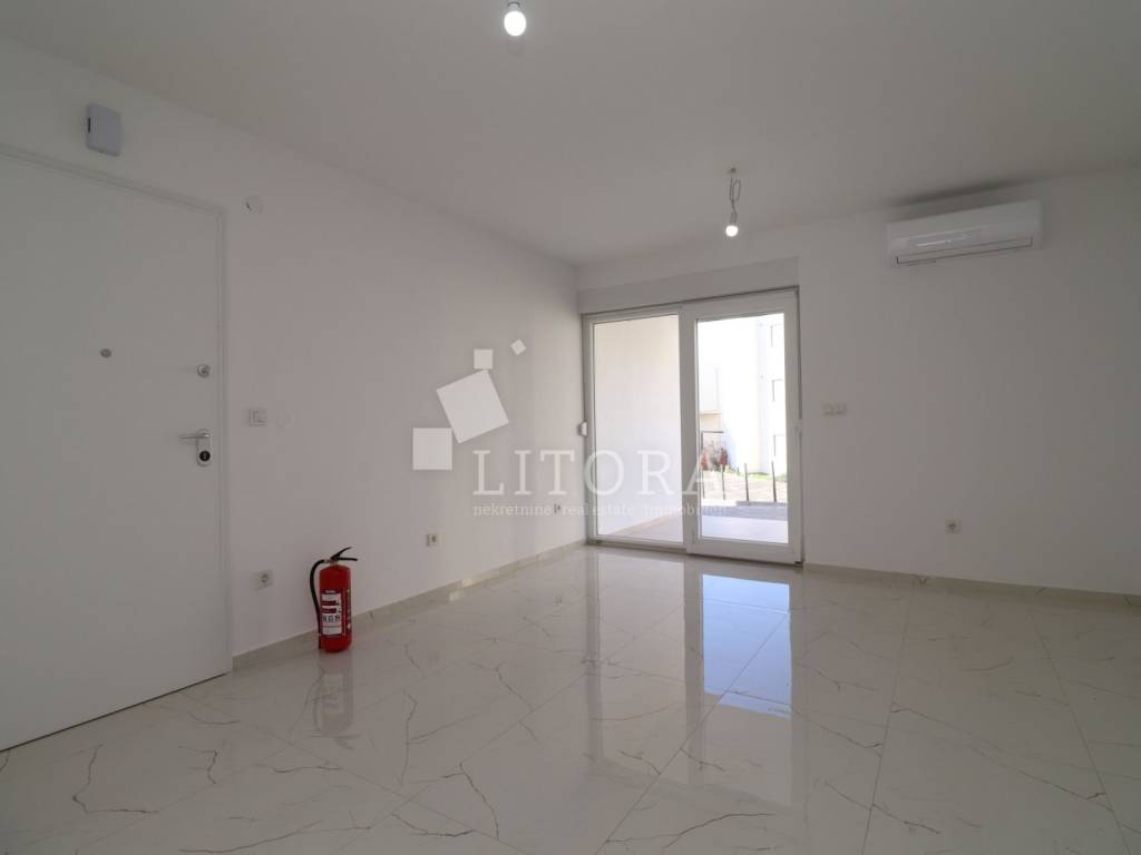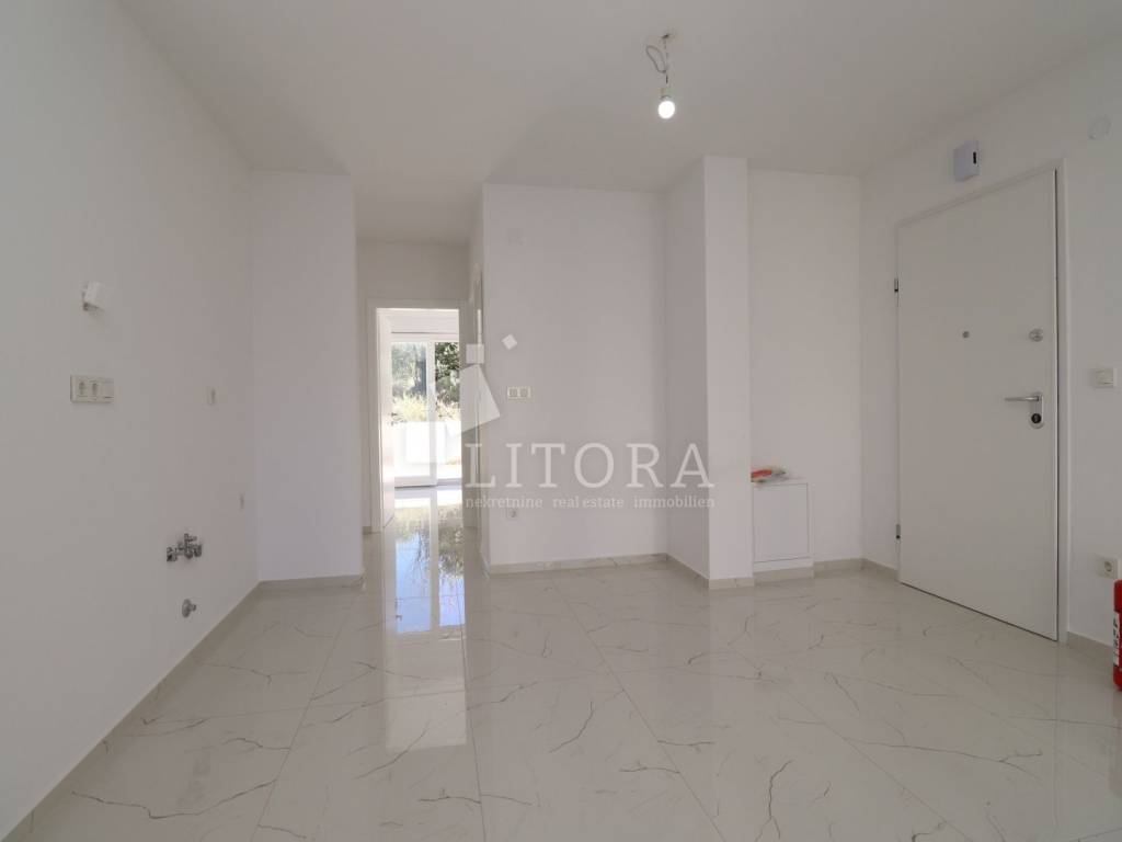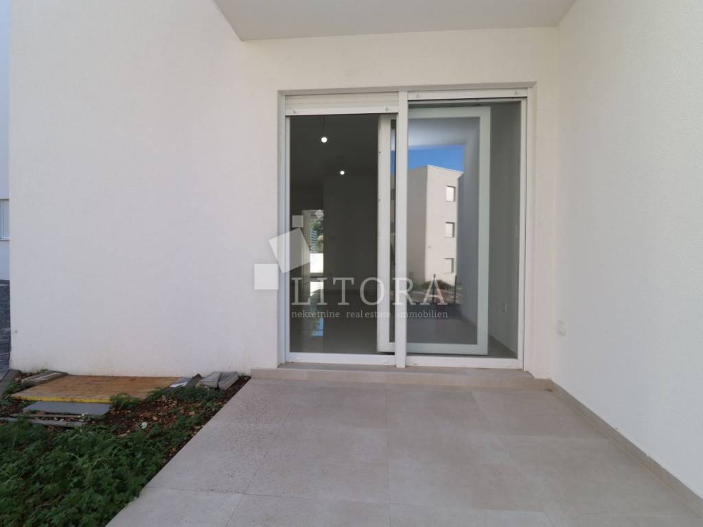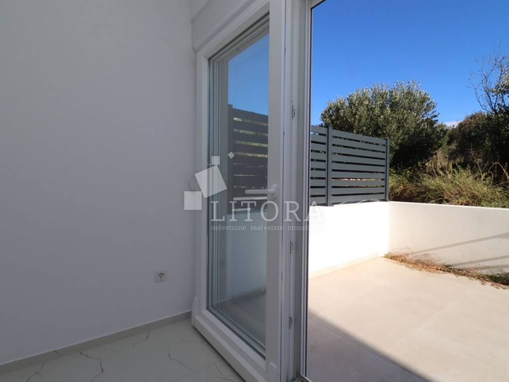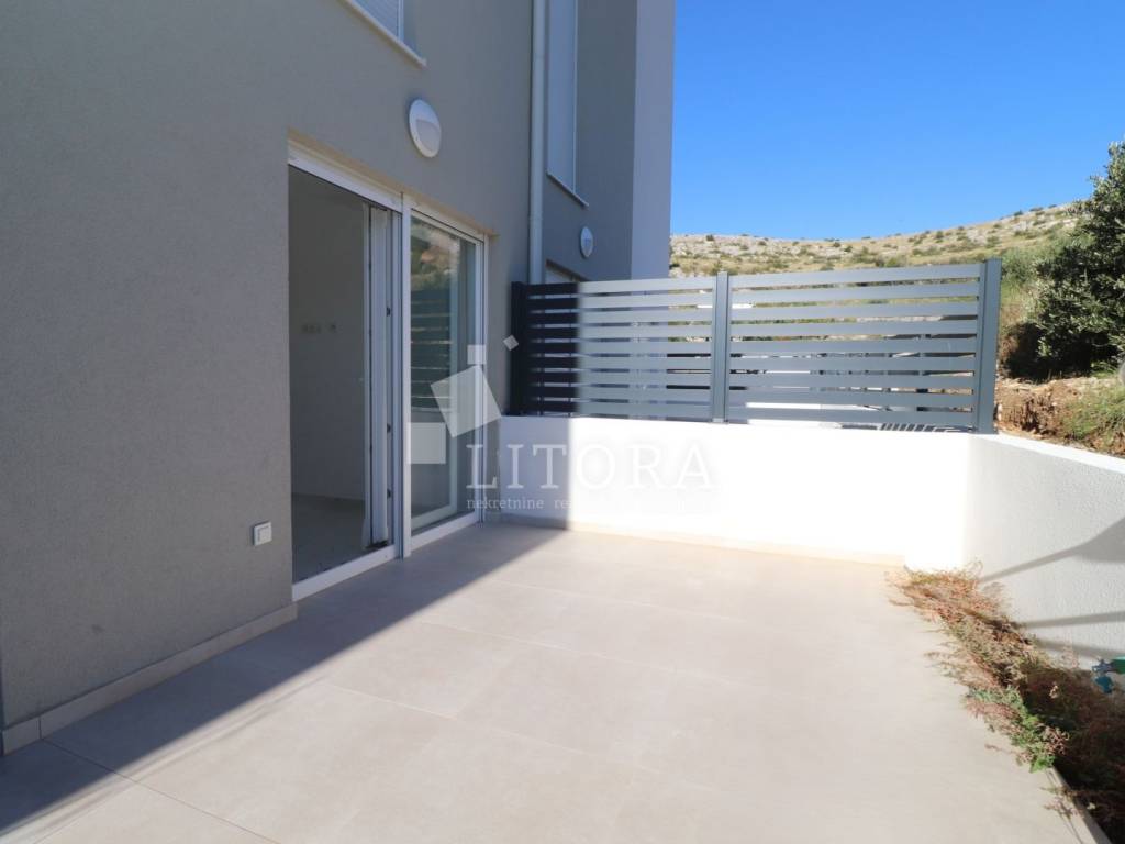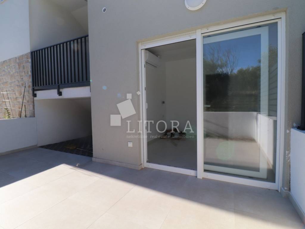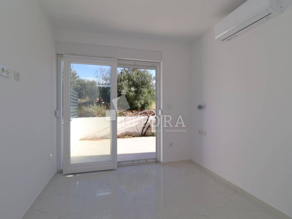 Žaborić – 200 m from the pebble beach. Newly built – move-in ready one-bedroom apartment with a small garden. Located in a highly attractive area of Žaborić, just 200 meters from the well-maintained beach and 300 meters from the town center, this modern one-bedroom apartment is situated on the ground floor of a high-quality new building. The total usable area of the apartment is 44.34 m². It is east–west oriented and located on the ground floor of a multi-apartment building. The apartment consists of a kitchen, dining area, and living room with access to a covered terrace of 5.82 m², next to a small flower garden of 4.93 m². Additionally, there is a hallway, bathroom, and a bedroom with access to a paved courtyard/terrace of 24.62 m² – a perfect spot for relaxation. The apartment is fully completed, move-in ready, and equipped with high-quality materials and finishes: modern ceramics, underfloor heating with a heat pump throughout the apartment, elegant sanitary ware, PVC windows with shutters, security entrance door, and air-conditioning units in both the living room and the bedroom. The apartment comes with one parking space.