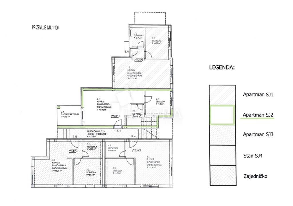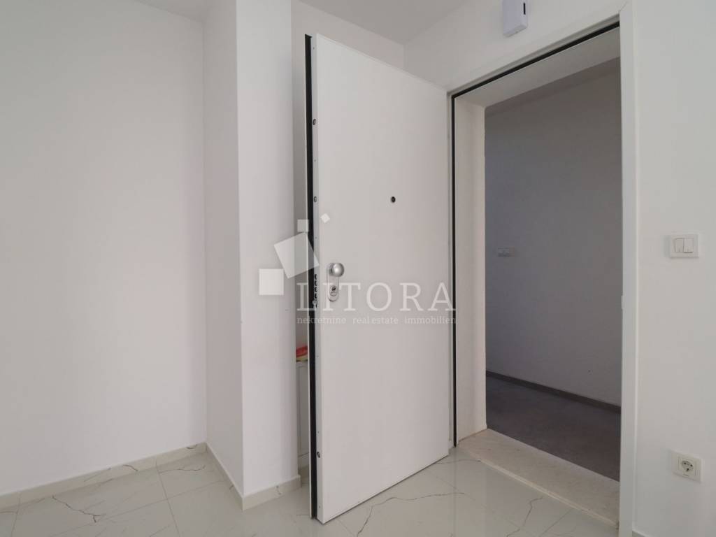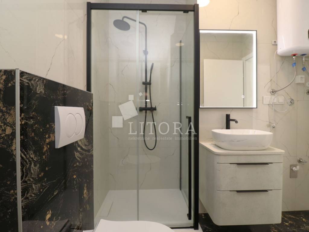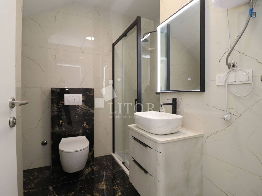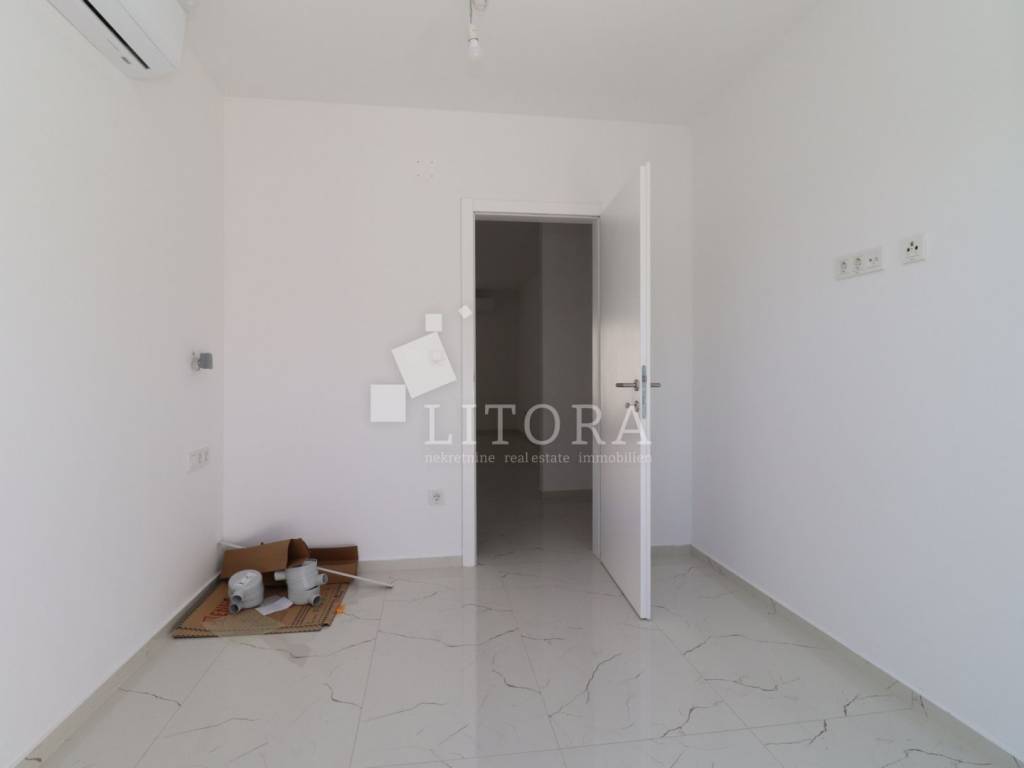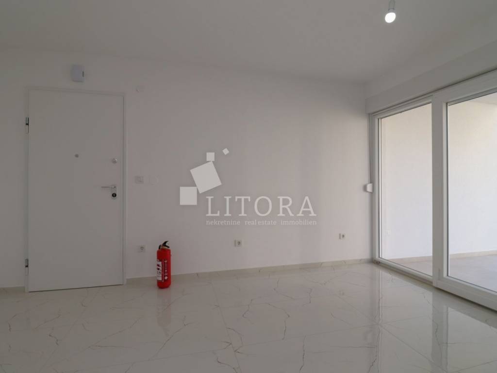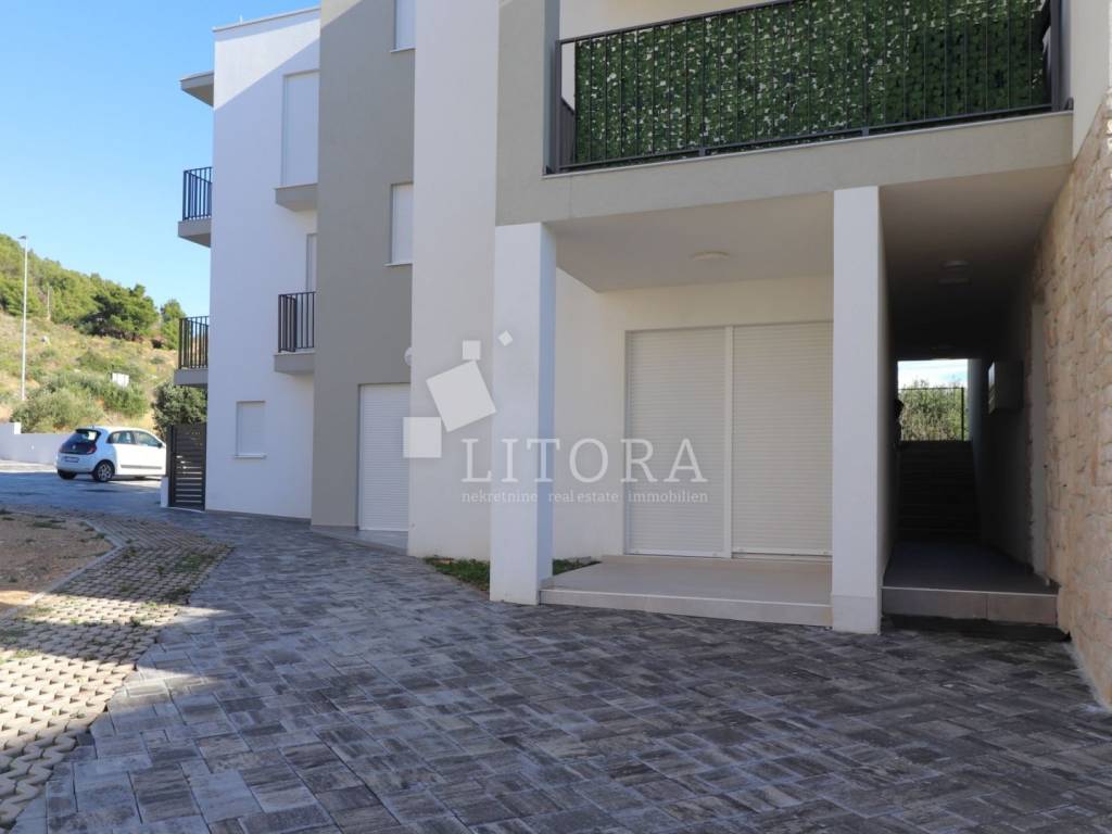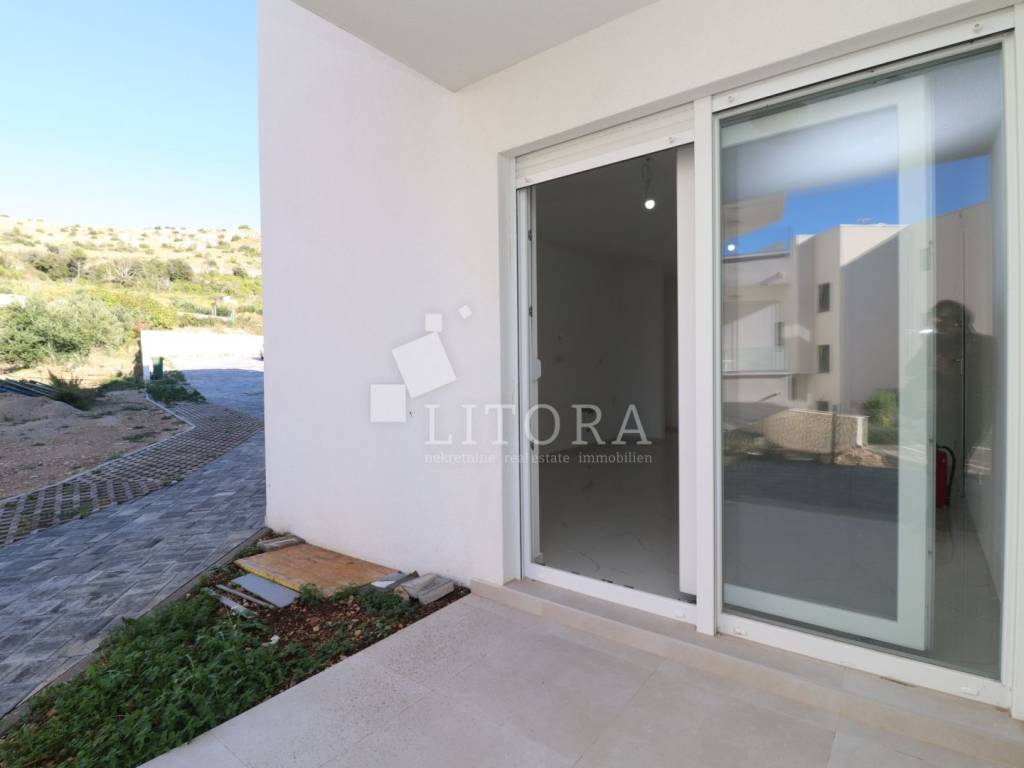 Žaborić – 200 m from the pebble beach. Newly built – move-in ready one-bedroom apartment with a small garden. Located in a highly attractive area of Žaborić, just 200 meters from the well-maintained beach and 300 meters from the town center, this modern one-bedroom apartment is situated on the ground floor of a high-quality new building. The total usable area of the apartment is 44.34 m². It is east–west oriented and located on the ground floor of a multi-apartment building. The apartment consists of a kitchen, dining area, and living room with access to a covered terrace of 5.82 m², next to a small flower garden of 4.93 m². Additionally, there is a hallway, bathroom, and a bedroom with access to a paved courtyard/terrace of 24.62 m² – a perfect spot for relaxation. The apartment is fully completed, move-in ready, and equipped with high-quality materials and finishes: modern ceramics, underfloor heating with a heat pump throughout the apartment, elegant sanitary ware, PVC windows with shutters, security entrance door, and air-conditioning units in both the living room and the bedroom. The apartment comes with one parking space.
