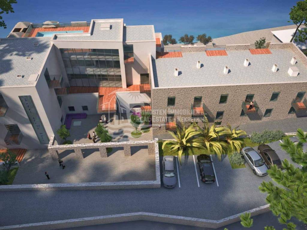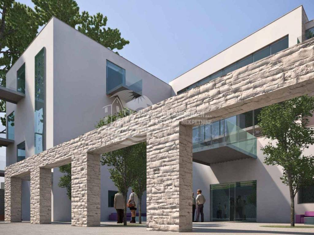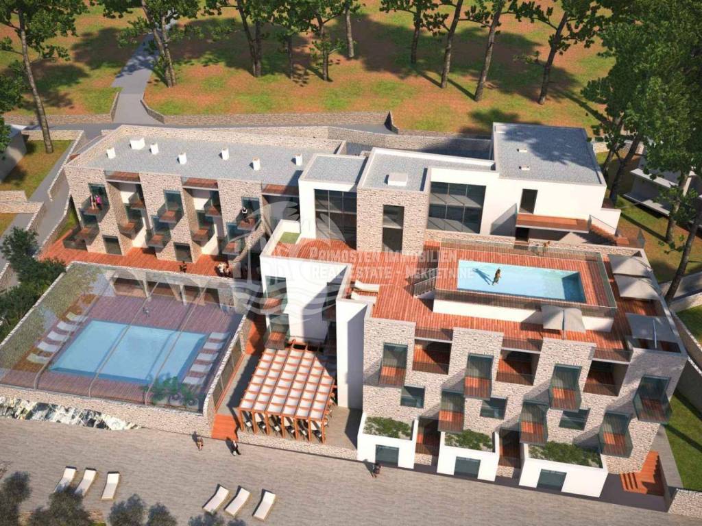 The hotel complex first row by the sea is designed as a freestanding object, with the main tourist-catering unit and as a single functional unit, formally linked in a harmonious composition of contemporary architectural expression. On the north west side of the ploot is resolved in and join the public road through the gate which can be reached at the plateau of the hotel parking lot. With the hotel has been solved only VIP-parking zone 10 PM. From the plateau down to the entrance square – cloister hotel pedestrian ramp to the hotel or circular stairs to the entrance, the north side of the pitch. Within the hospitality tourism zone „Gornji Muli“ parking is planned to solve the common parking zone of suitable capacity in the north of the plots as a shared public parking. Purpose of the hotel's hospitality and tourism, is planned for 4-star hotel. Hotel Forum will have 40 luxury rooms with sea view, restaurant, coffee bar with room for projection, a spa area with fitness room, solarium, sauna, massage, beauty salon, relaxation area, 2 pools, private beach and water front promenade where planned three souvenir shops selling press and other supporting facilities and services related toe the functioning of the hotel. Hotel Forum is a total gross area of 3838 m2, height S + GF + 2F, and the gross land area is ca. 6.000 m2.
