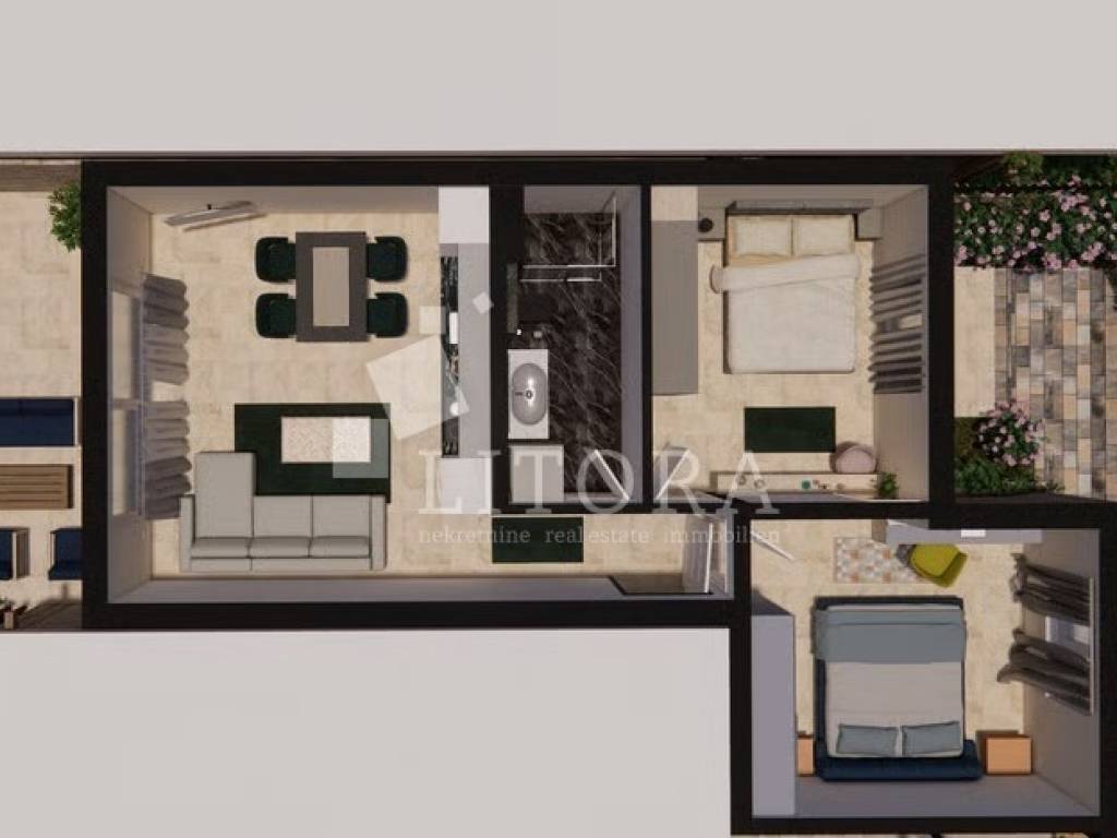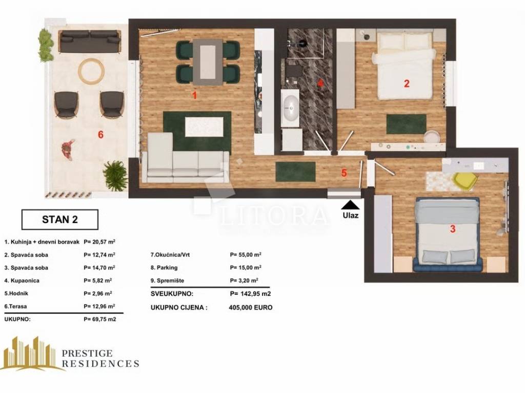 Brodarica Prestige Residences, an exclusive residential project in close proximity to the sea. Residence 2 – Apartment S2, with a total usable area of 81.71 m², is located on the ground floor of a smaller residential building. The apartment has an area of 56.79 m² and consists of two bedroom, a bathroom, a kitchen with dining area that opens onto a terrace of 12.96 m² and a courtyard of 55 m². The apartment includes a parking space of 15 m² and a storage room of 3.20 m². It will be equipped with high-quality premium stone wool insulation, aluminum joinery with insect screens and triple glazing, premium ceramics and sanitaryware, premium three-layer parquet, underfloor heating in the bathroom and living room, and air conditioning units. The courtyard will be landscaped with greenery, a pergola on the terrace, a barbecue, and underground waste containers. Completion and move-in are scheduled for the end of 2026. The distance to the sea/beach is only 80 meters, making this property ideal for a peaceful family life or for tourist rental.