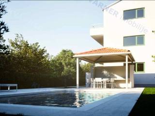 The apartment consists of an open-concept kitchen, dining area, and living room, three bedrooms, and two modernly designed bathrooms. From the living room, there is access to a spacious 17 m² terrace, and the apartment also includes a private garden with a swimming pool ideal for relaxation and enjoying privacy. The property comes with two parking spaces.