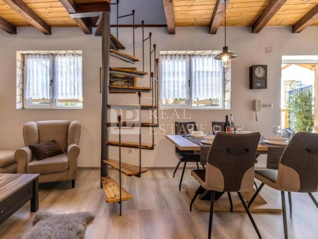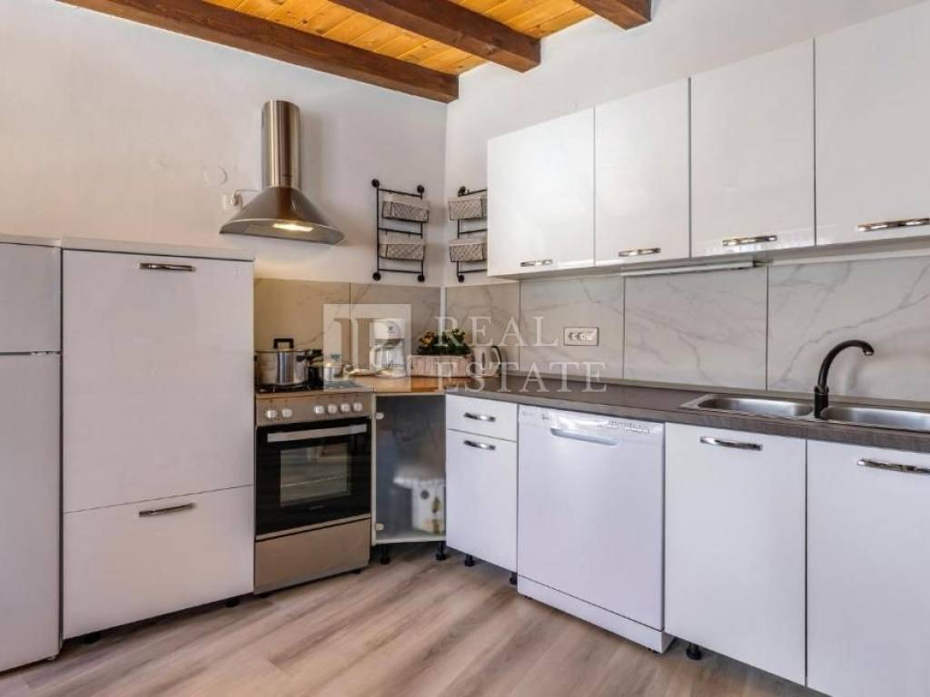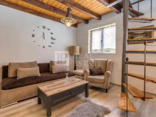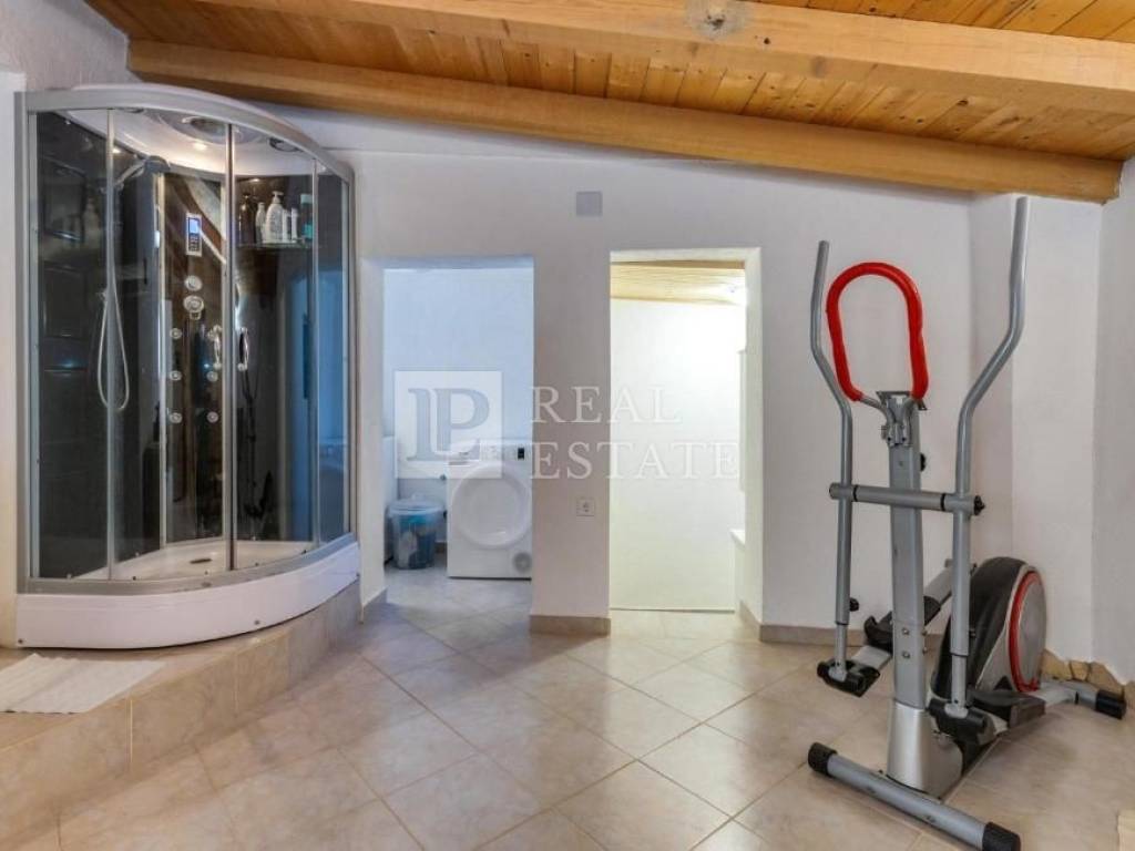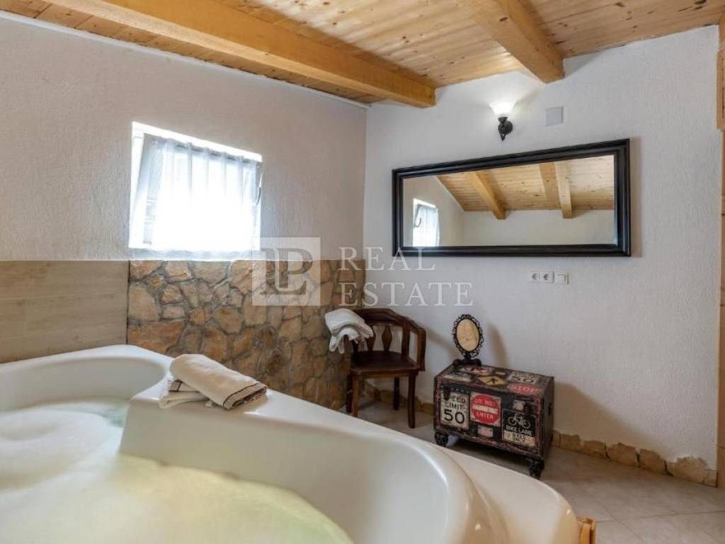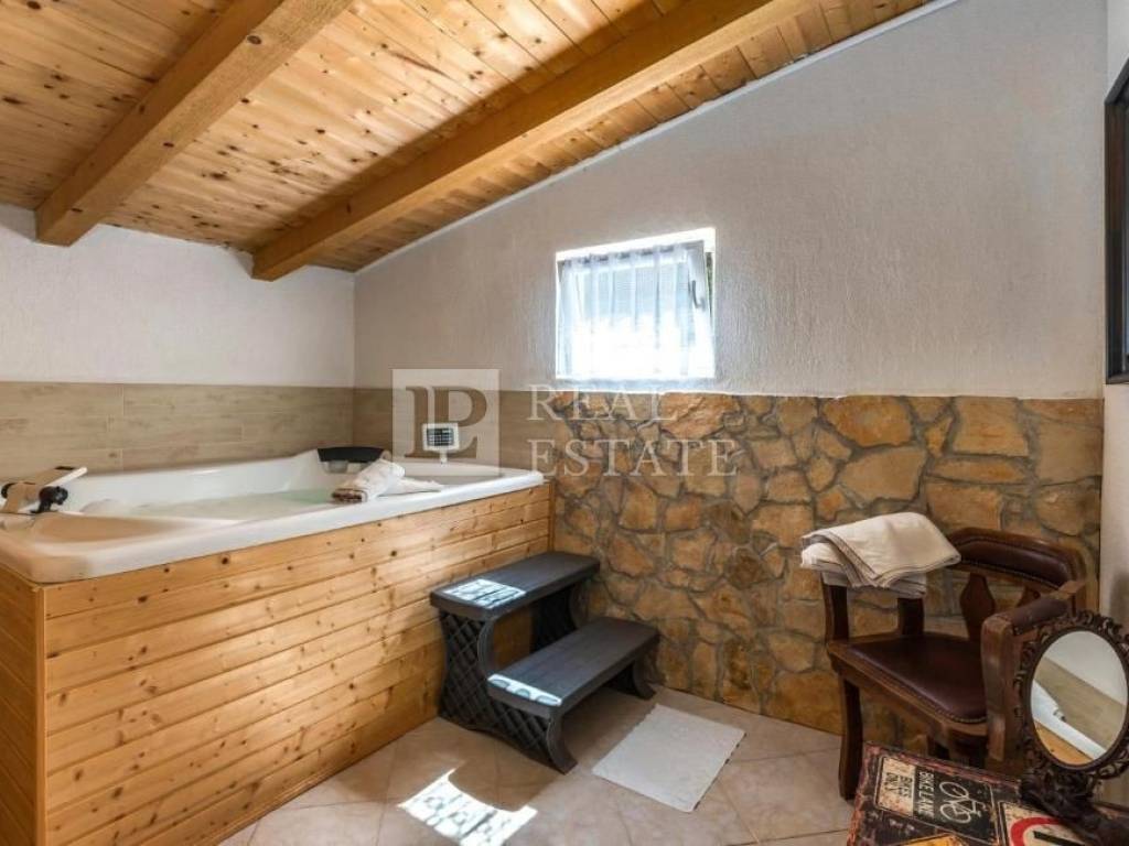 The house has a living area of 144 m2 and consists of a living room, a kitchen with a dining room, two bedrooms, a bathroom and a wellness area with a sauna and a jacuzzi. The house is air-conditioned, has a fireplace in the living room and is fully equipped with new and modern furniture.