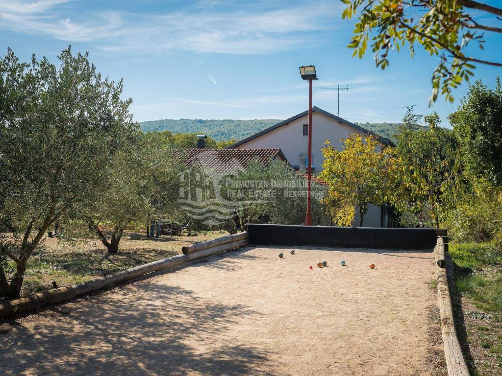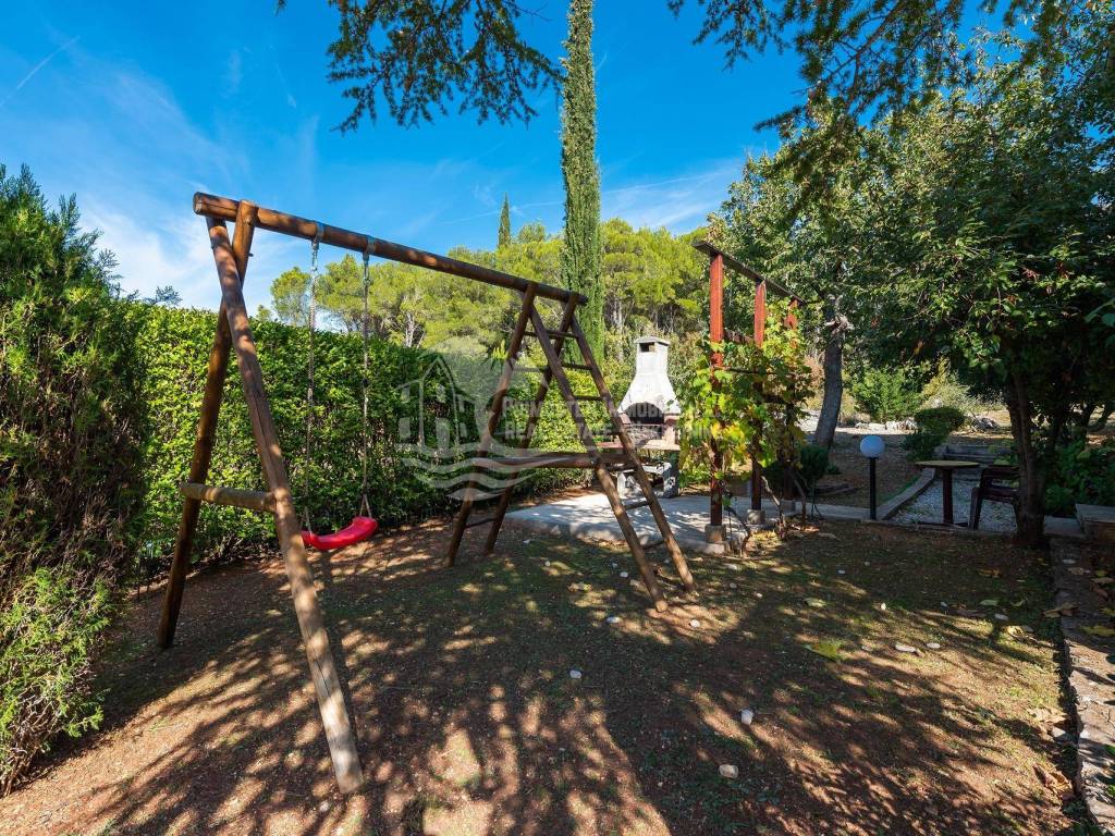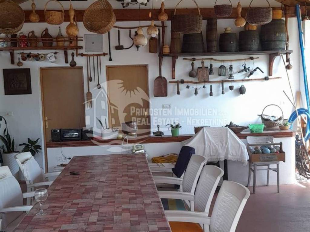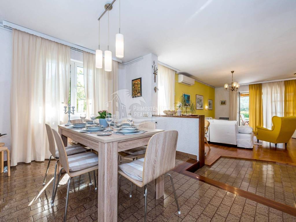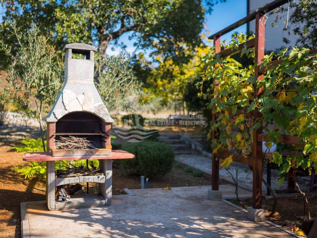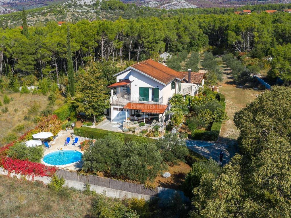 A two-storey villa with a pool near Sibenik is for sale, in a quiet and discreet location. The house has a living area of ​​245 m², and has plots with a total area of ​​5000 m². The land is planned to be divided into parcels for sale, and 1677 m² of house and garden would be sold as part of it. The house consists of a ground floor and a first floor, and it also has a tavern. The ground floor has an area of ​​94 m² and consists of a living room, dining room, kitchen, toilet, hallway and a covered terrace of 20 m². There is also a 25 m² garage on the ground floor. The upper floor has an area of ​​74 m² and there is also a covered terrace of 25 m² and a balcony of 15 m². On the first floor there are two bedrooms, two bathrooms and a staircase. Next to the house there is also a tavern of 77 m² with a covered terrace of 50 m². The tavern has a basement, bathroom, toilet, storage room and boiler room. The house is located in a quiet location, surrounded by a beautiful pine forest, and there is also a round swimming pool with an associated area for sunbathing and an outdoor shower. On the side of the house there is a barbecue and a children's playground. The advantage of buying a house is the possibility to agree on the size of the plot, the sea is a five-minute drive away, and the Krka National Park is nearby. The house has four stars and a well-established rental business.
