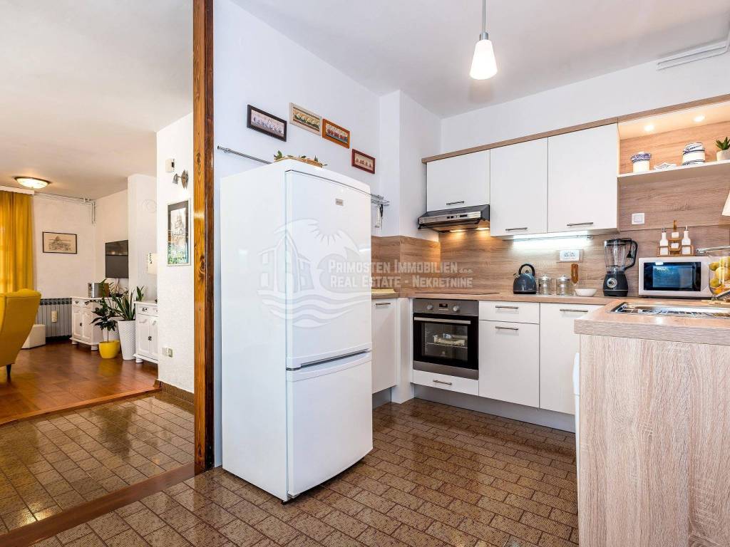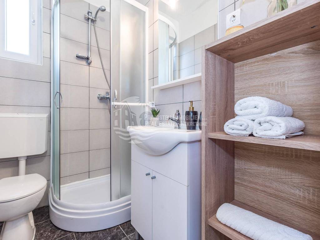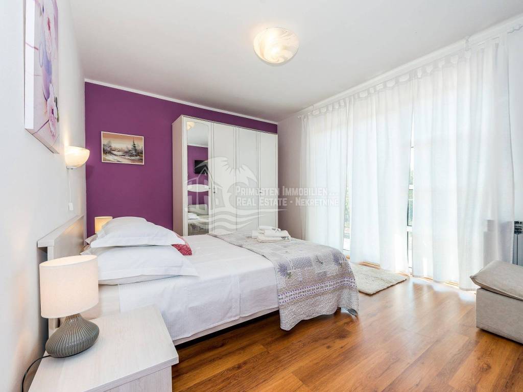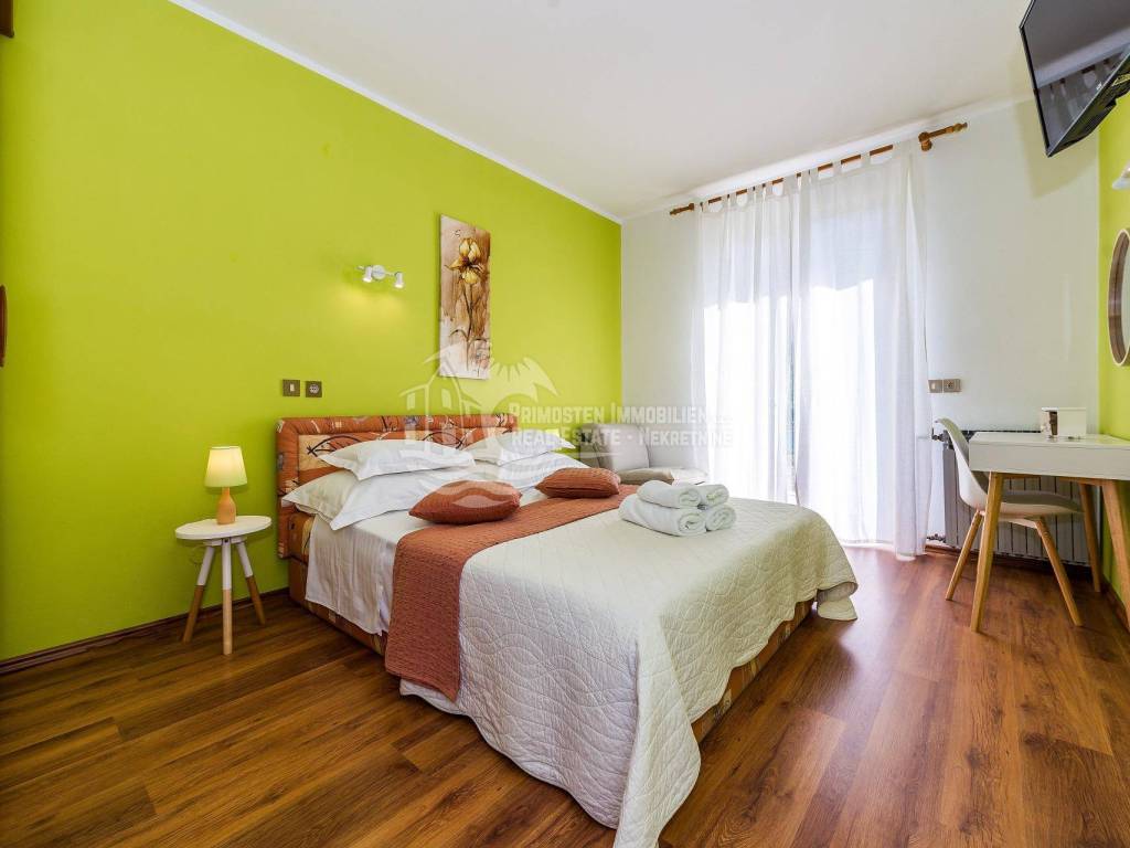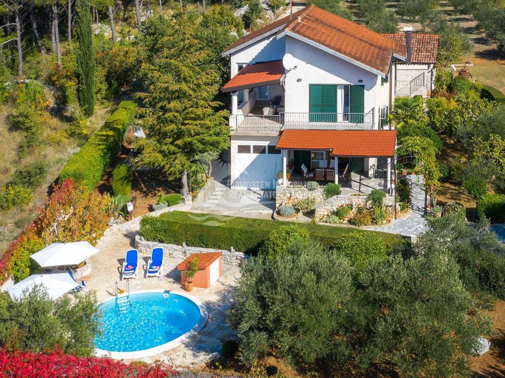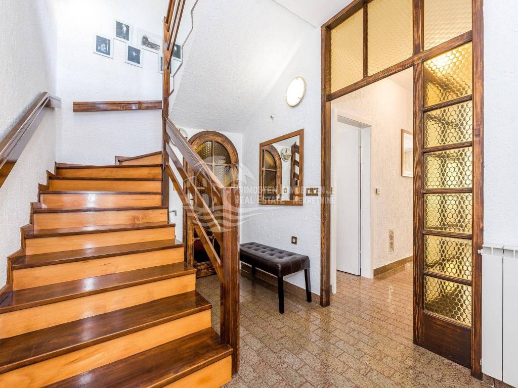 A two-storey villa with a pool near Sibenik is for sale, in a quiet and discreet location. The house has a living area of ​​245 m², and has plots with a total area of ​​5000 m². The land is planned to be divided into parcels for sale, and 1677 m² of house and garden would be sold as part of it. The house consists of a ground floor and a first floor, and it also has a tavern. The ground floor has an area of ​​94 m² and consists of a living room, dining room, kitchen, toilet, hallway and a covered terrace of 20 m². There is also a 25 m² garage on the ground floor. The upper floor has an area of ​​74 m² and there is also a covered terrace of 25 m² and a balcony of 15 m². On the first floor there are two bedrooms, two bathrooms and a staircase. Next to the house there is also a tavern of 77 m² with a covered terrace of 50 m². The tavern has a basement, bathroom, toilet, storage room and boiler room. The house is located in a quiet location, surrounded by a beautiful pine forest, and there is also a round swimming pool with an associated area for sunbathing and an outdoor shower. On the side of the house there is a barbecue and a children's playground. The advantage of buying a house is the possibility to agree on the size of the plot, the sea is a five-minute drive away, and the Krka National Park is nearby. The house has four stars and a well-established rental business.
