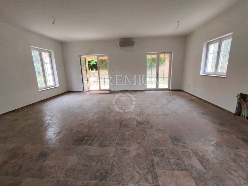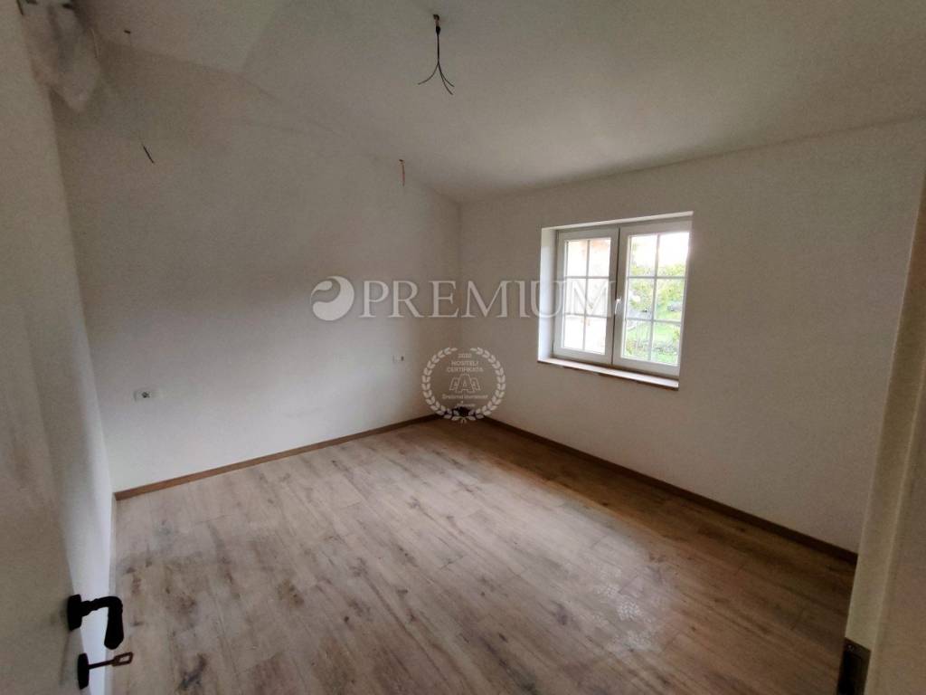 The house is characterized by a functional layout, modern design, high-quality construction, sanitary facilities, ceramic and parquet flooring, PVC joinery, underfloor heating, and a stone façade.