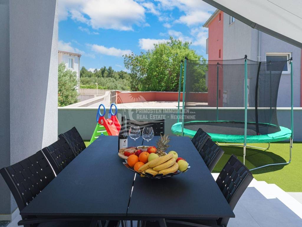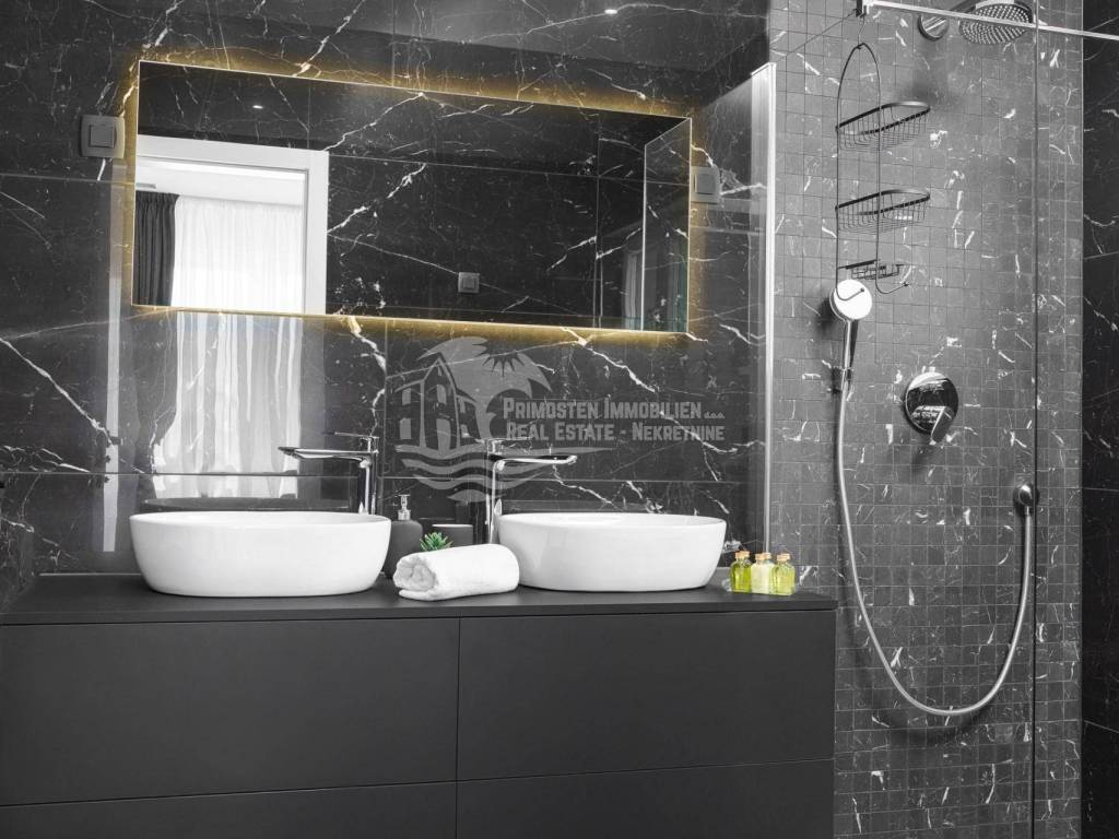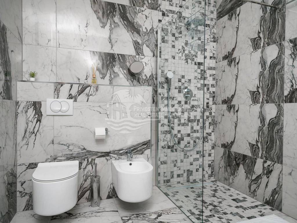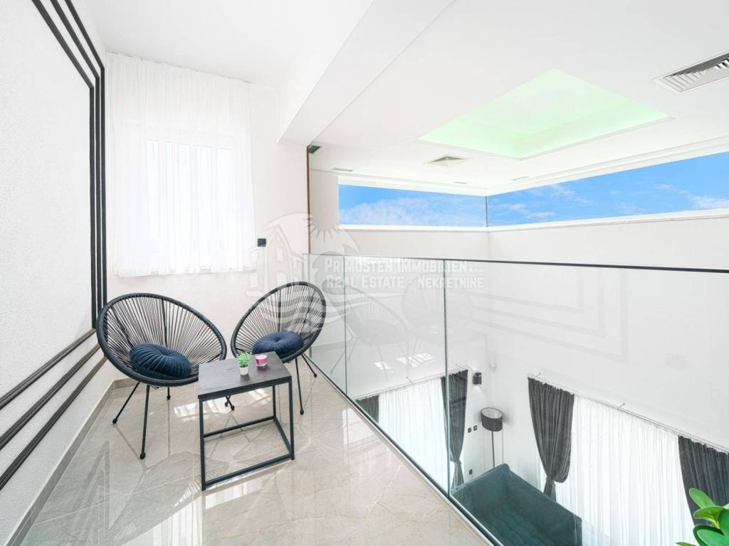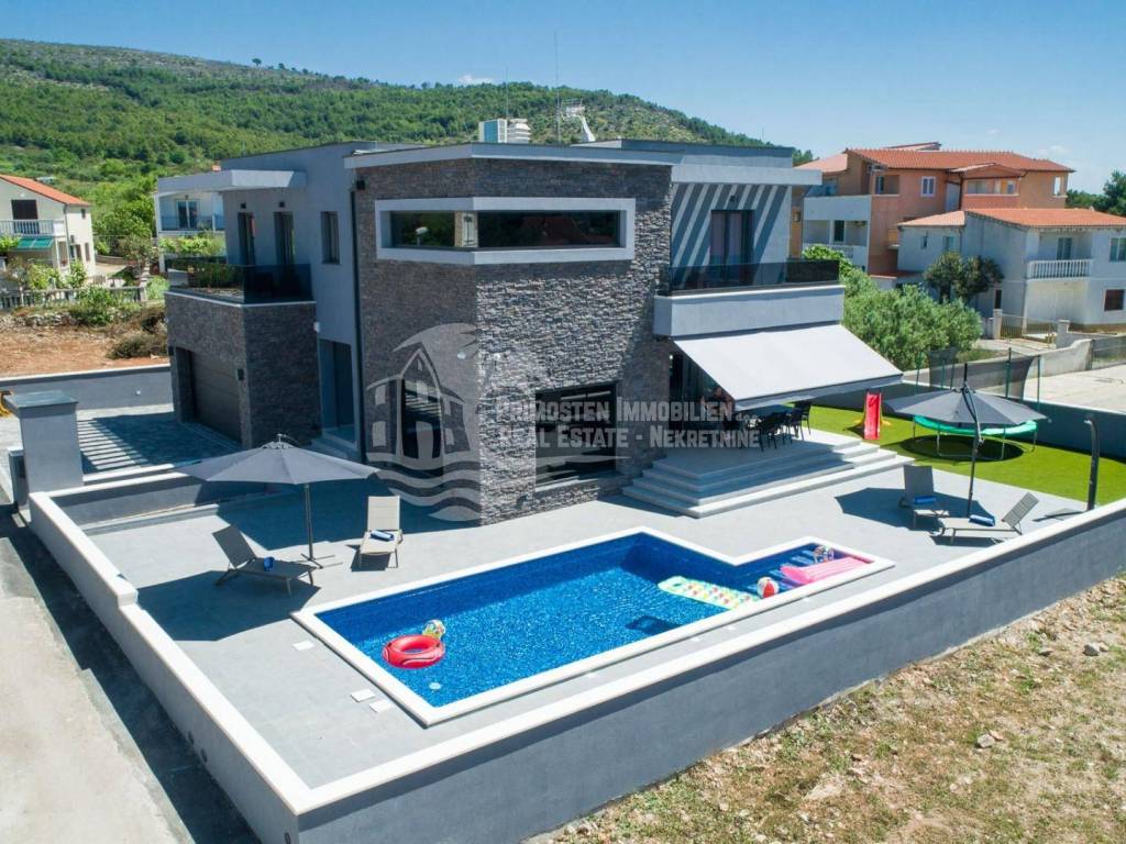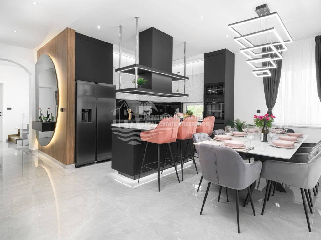 Superbly equipped villa near Vodice, living area 325 m². The area of the land on which it was built is 600 m². This top smart villa is equipped with the latest technology and was built according to the latest construction standards. The villa extends over two floors and has a basement. On the first floor, there is a living room with a high ceiling that adds a touch of luxury to the space. There is also a superbly equipped kitchen with Samsung appliances, one bedroom and a bathroom. From this part there is a passage to the garage. From the living room there is access to the terrace where there is a 34 m² swimming pool with outdoor furniture. The pool currently does not have heating, however installations have been made if it is desired. Upstairs there are three bedrooms, one of which has its own bathroom, while the other two share another bathroom. The rooms have access to the balcony. There is also a spacious walk-in closet, which adds an extra dose of glamor to the whole story. Underfloor heating extends throughout the house, a heat pump is installed, all rooms are air-conditioned and the house has external insulation of 10 cm Styrofoam. The floors are paved with first class tiles, and in the living room there is also a three-layer oak parquet of 12 mm of high quality. The house also has a basement with an engine room and a space that can be used as a gym. The infrastructure has electricity and water connections and a bio pit. The whole house is connected via the smart home system. Excellent incomes are realized annually in tourism. It is about 300 m from the sea and is located in a quiet location.