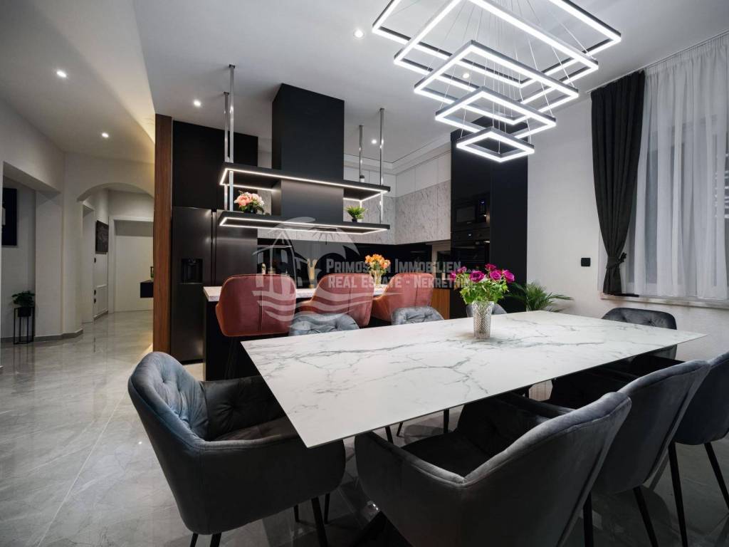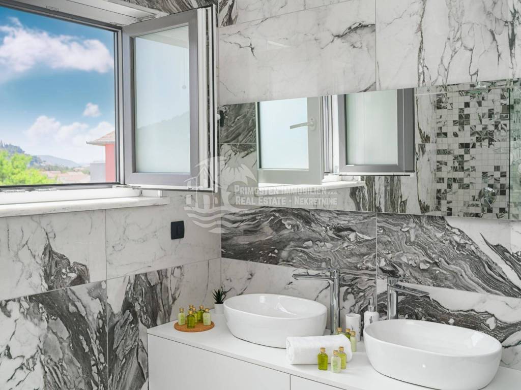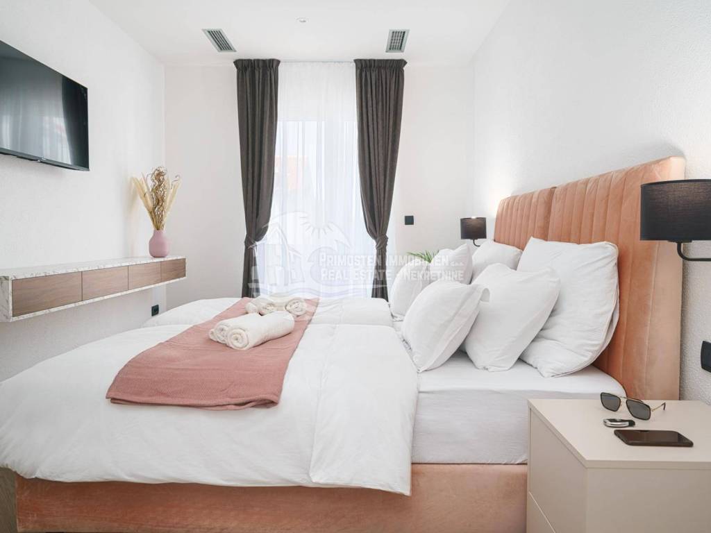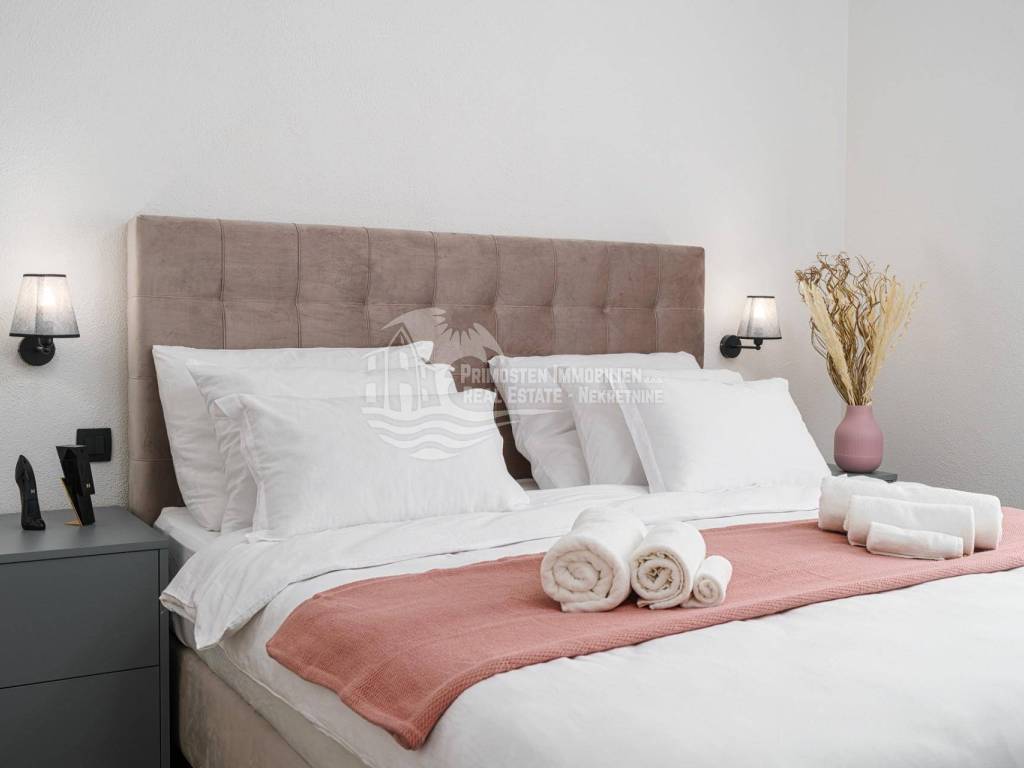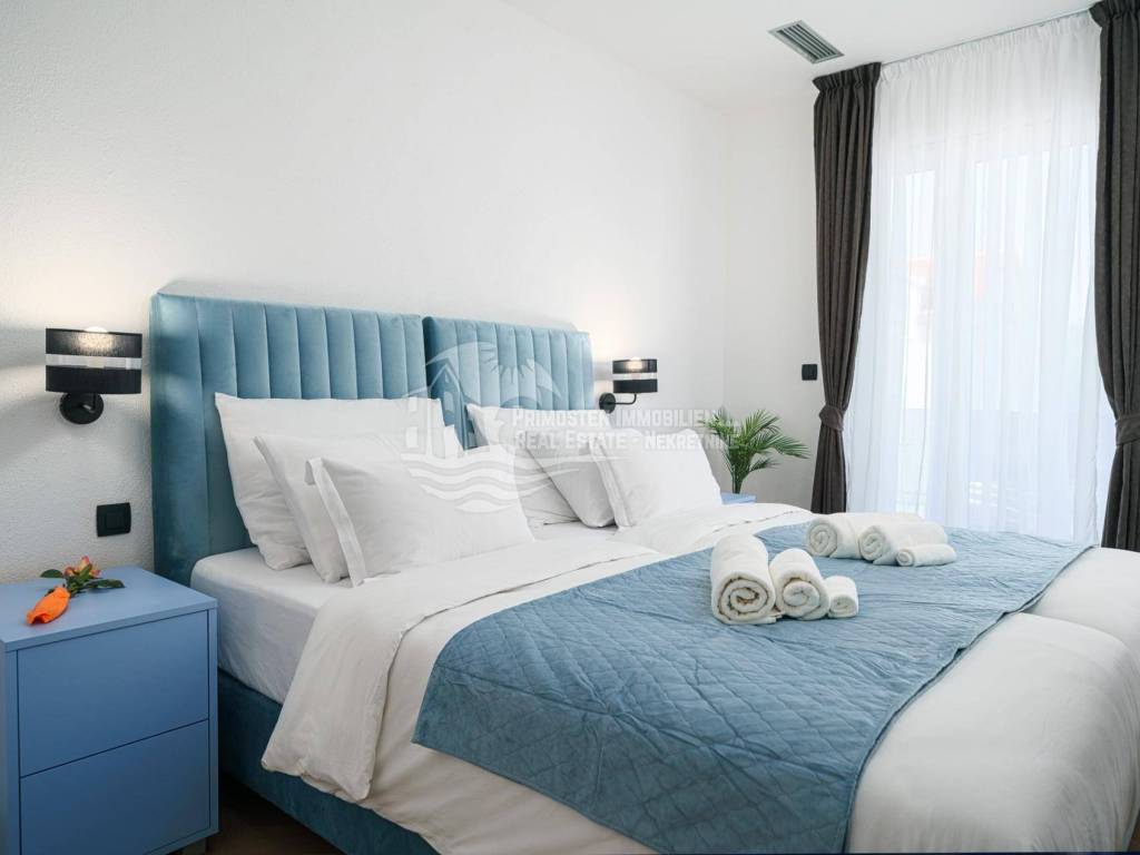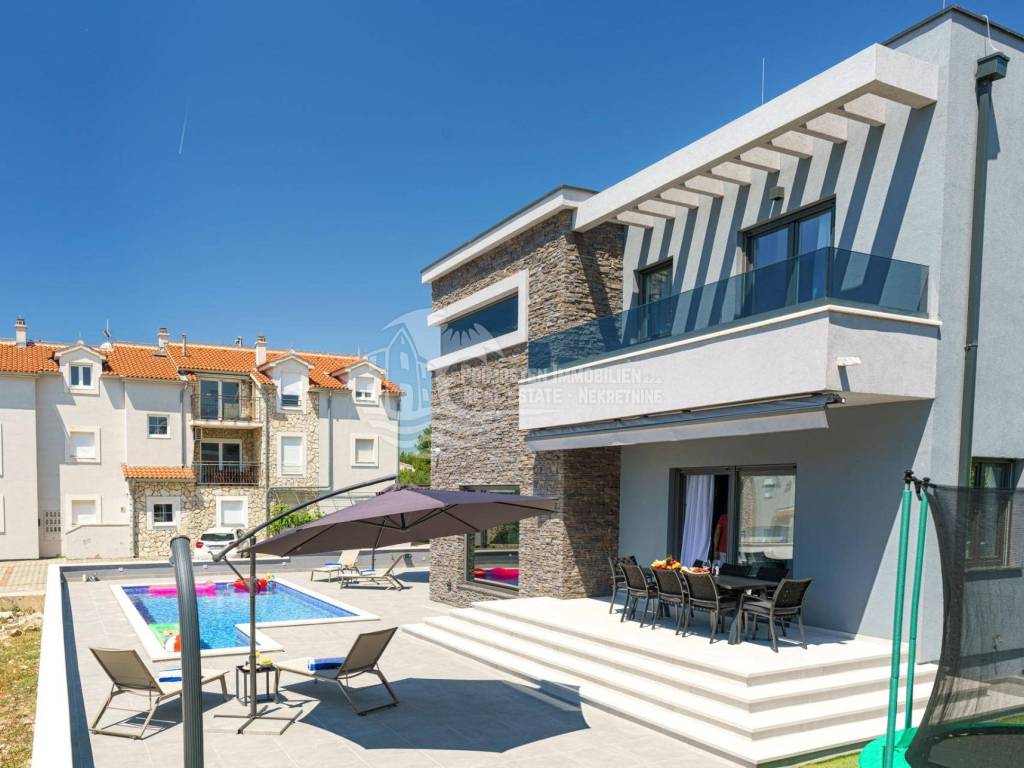 Superbly equipped villa near Vodice, living area 325 m². The area of the land on which it was built is 600 m². This top smart villa is equipped with the latest technology and was built according to the latest construction standards. The villa extends over two floors and has a basement. On the first floor, there is a living room with a high ceiling that adds a touch of luxury to the space. There is also a superbly equipped kitchen with Samsung appliances, one bedroom and a bathroom. From this part there is a passage to the garage. From the living room there is access to the terrace where there is a 34 m² swimming pool with outdoor furniture. The pool currently does not have heating, however installations have been made if it is desired. Upstairs there are three bedrooms, one of which has its own bathroom, while the other two share another bathroom. The rooms have access to the balcony. There is also a spacious walk-in closet, which adds an extra dose of glamor to the whole story. Underfloor heating extends throughout the house, a heat pump is installed, all rooms are air-conditioned and the house has external insulation of 10 cm Styrofoam. The floors are paved with first class tiles, and in the living room there is also a three-layer oak parquet of 12 mm of high quality. The house also has a basement with an engine room and a space that can be used as a gym. The infrastructure has electricity and water connections and a bio pit. The whole house is connected via the smart home system. Excellent incomes are realized annually in tourism. It is about 300 m from the sea and is located in a quiet location.