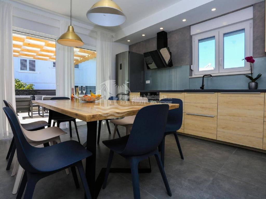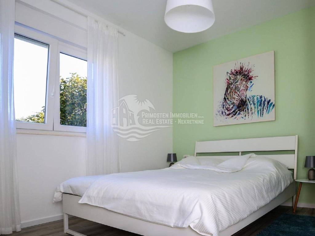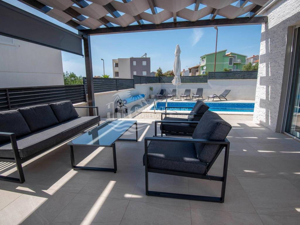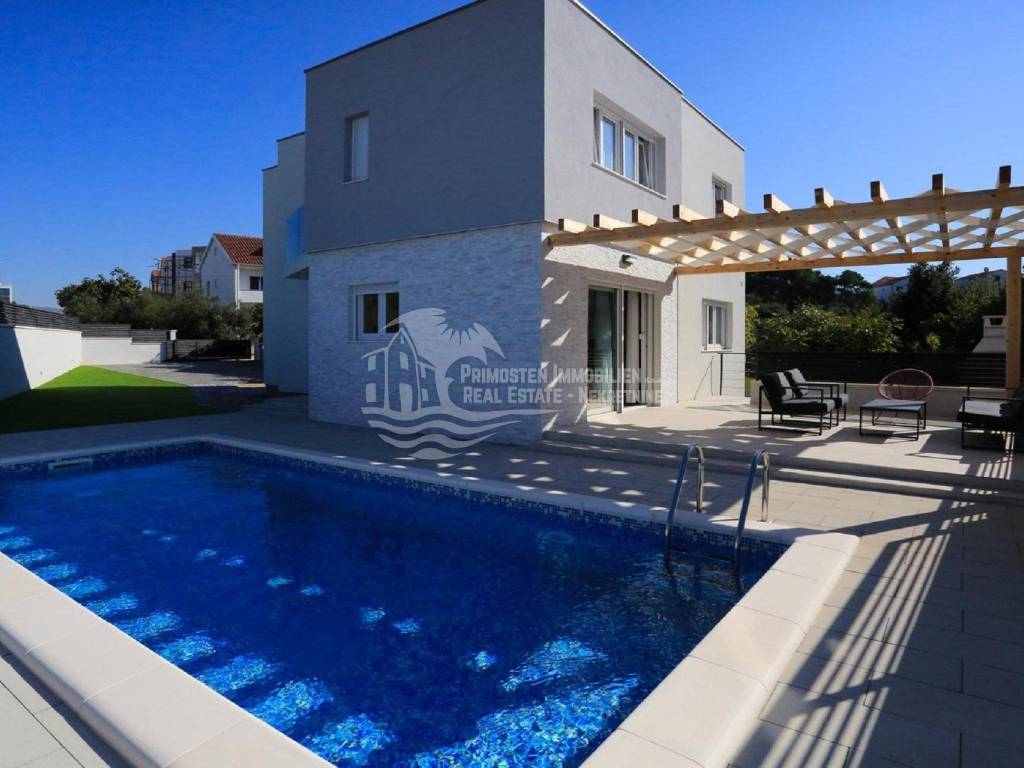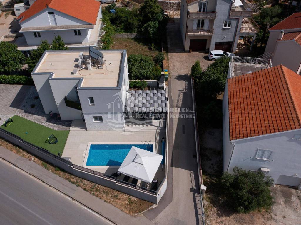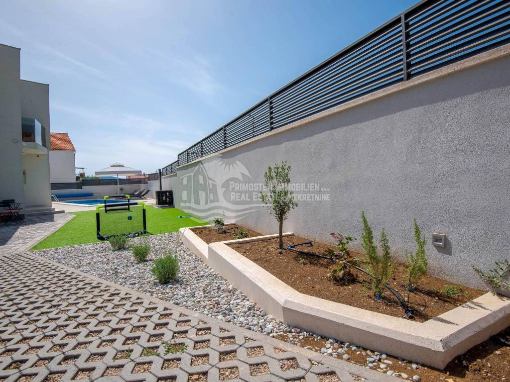 In a smaller town near Sibenik, there is a modern two-story villa, furnished with a fully landscaped garden. The house extends over two floors plus a basement - ground floor and first floor and has an area of 197 m², and is located on a plot of 400 m². On the ground floor there is a living room, a kitchen with a dining room, one bedroom, a bathroom and access to a covered terrace with a swimming pool. An internal staircase leads to the first floor, where there are three bedrooms with two bathrooms. In the basement there is a fitness area and a sauna. There are three parking spaces, a barbecue, and a garden. The house is equipped with solar panels, which contributes to saving electricity, and at the same time has a heated pool. The house also has underfloor heating and the rooms are air-conditioned. The property is quality built and is located approximately 300m from the sea. The yard is beautifully landscaped, and the property is approximately 300 m from the beach.