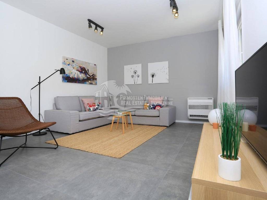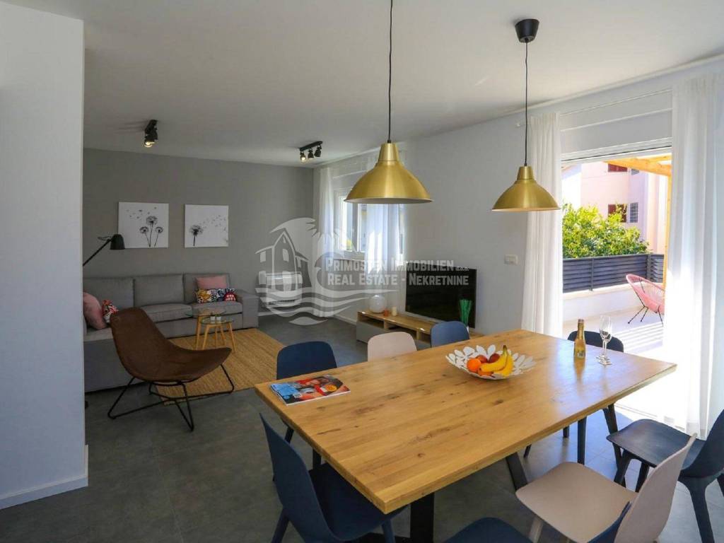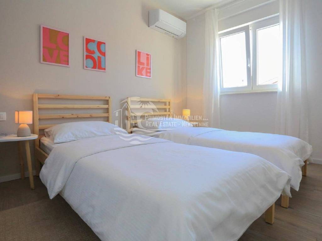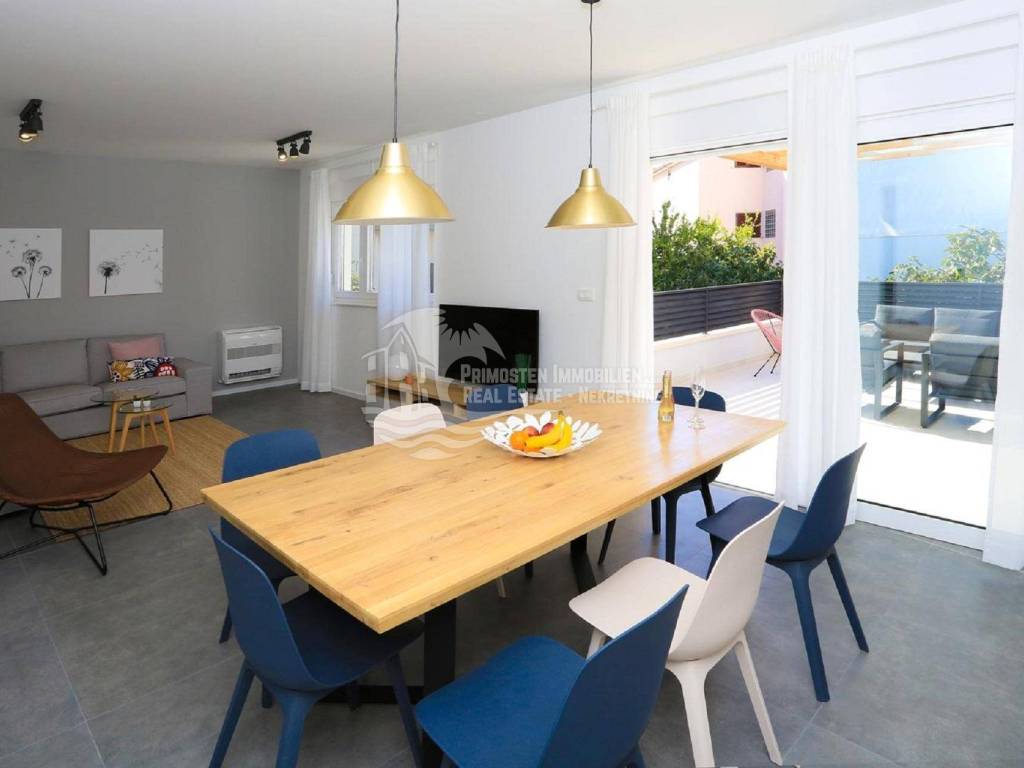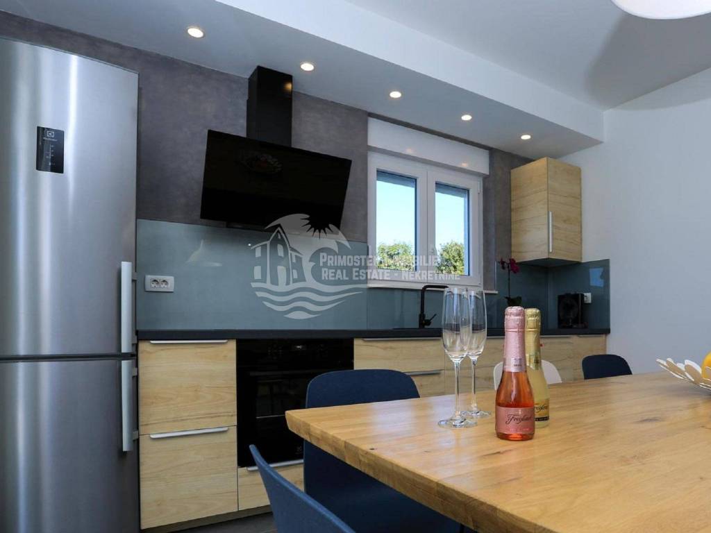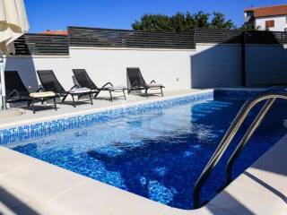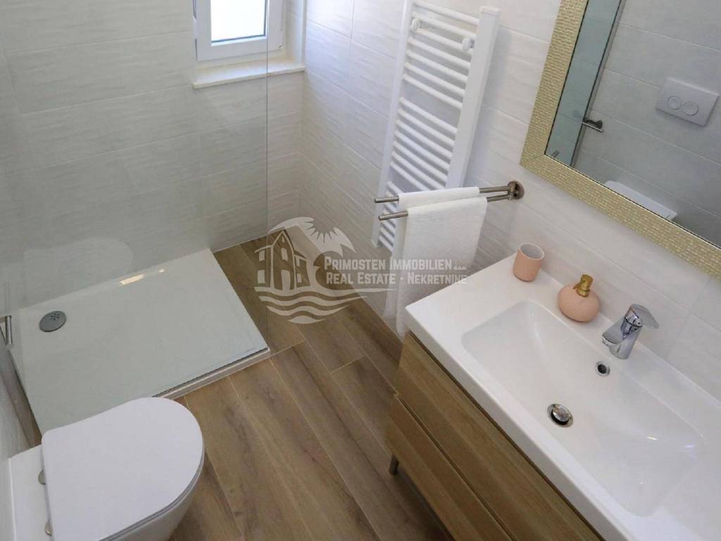 In a smaller town near Sibenik, there is a modern two-story villa, furnished with a fully landscaped garden. The house extends over two floors plus a basement - ground floor and first floor and has an area of 197 m², and is located on a plot of 400 m². On the ground floor there is a living room, a kitchen with a dining room, one bedroom, a bathroom and access to a covered terrace with a swimming pool. An internal staircase leads to the first floor, where there are three bedrooms with two bathrooms. In the basement there is a fitness area and a sauna. There are three parking spaces, a barbecue, and a garden. The house is equipped with solar panels, which contributes to saving electricity, and at the same time has a heated pool. The house also has underfloor heating and the rooms are air-conditioned. The property is quality built and is located approximately 300m from the sea. The yard is beautifully landscaped, and the property is approximately 300 m from the beach.
