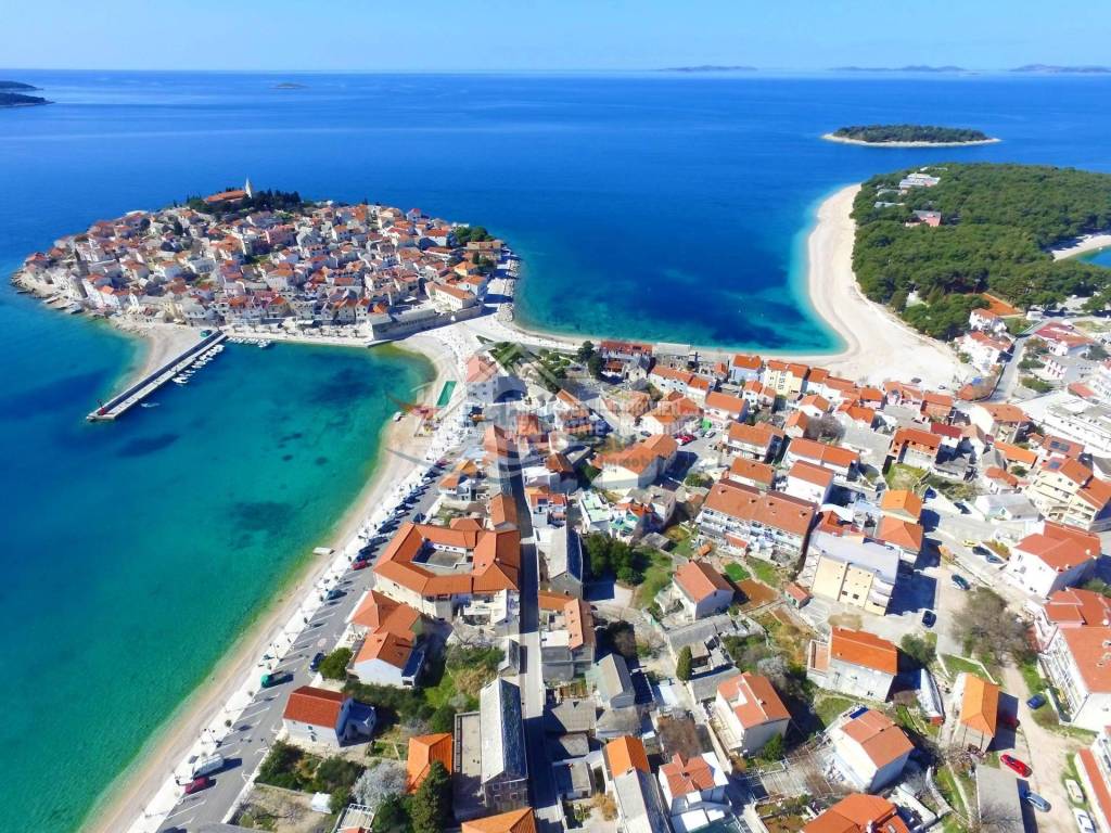 The building plot in Primosten covers 1214 m² and is about 3.5 km from the town center. The dimensions are approx. 30 m wide and 42 m long and is suitable for building two houses. Electricity and water connections are directly on the property and therefore the development costs are very low. According to the development plan, three floors can be built, with a maximum height of 9 m. The surroundings is flat and there are numerous walking and cycling trails. Furthermore, there are shops such as a supermarket, bakery and cafe in the immediate vicinity. If you stand directly on the ground you don't have a sea view, but from a height of approx. 4 m you can enjoy a fantastic panoramic view of the beautiful coastal landscape and the sea. The distance to the town center and the well-known beach of Primosten is approx. 3.5 km and to Split Airport approx. 35 km.