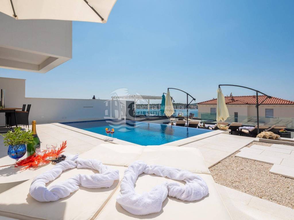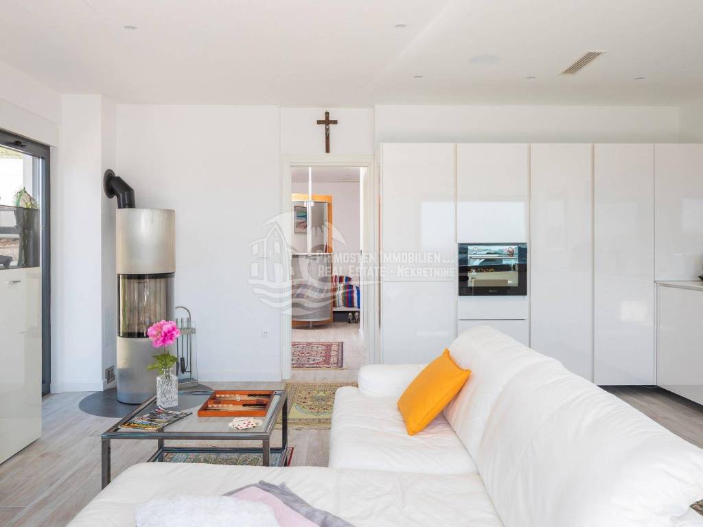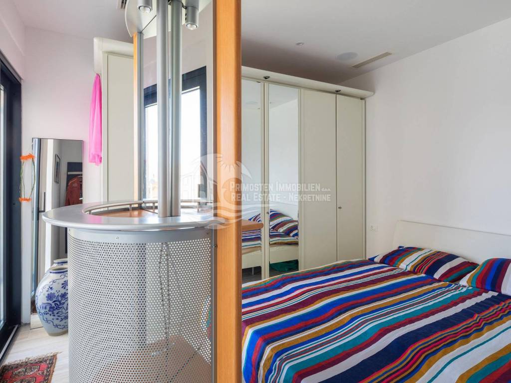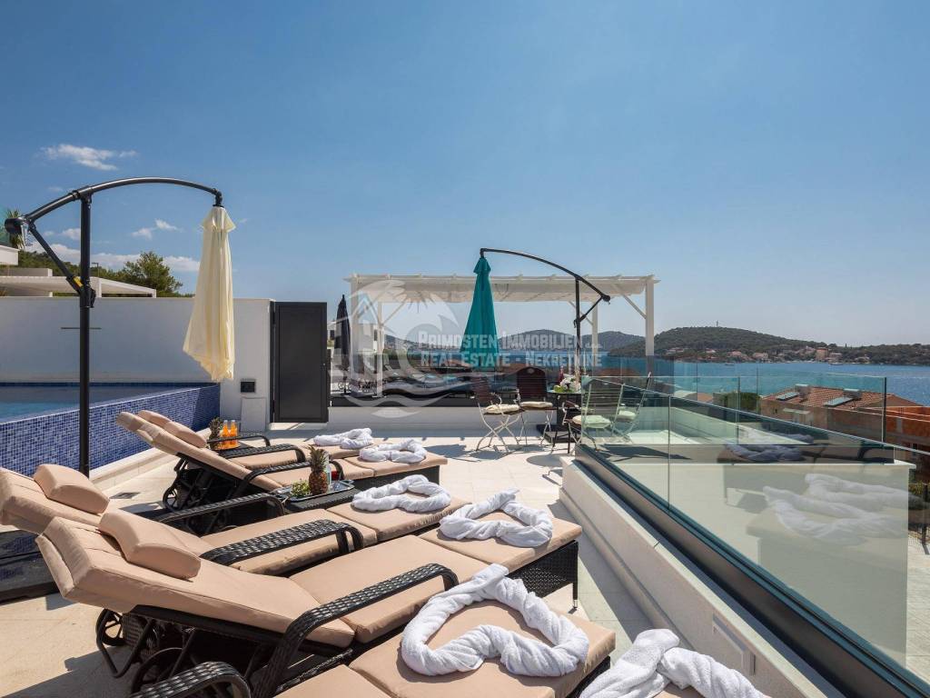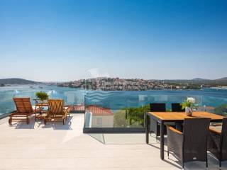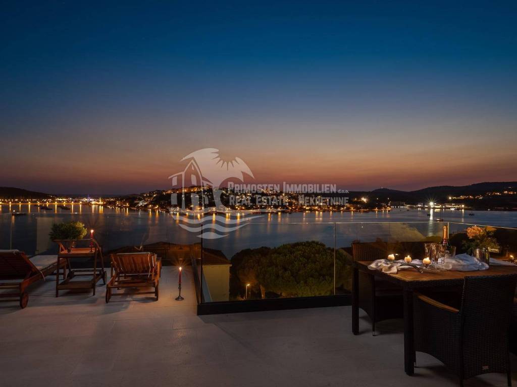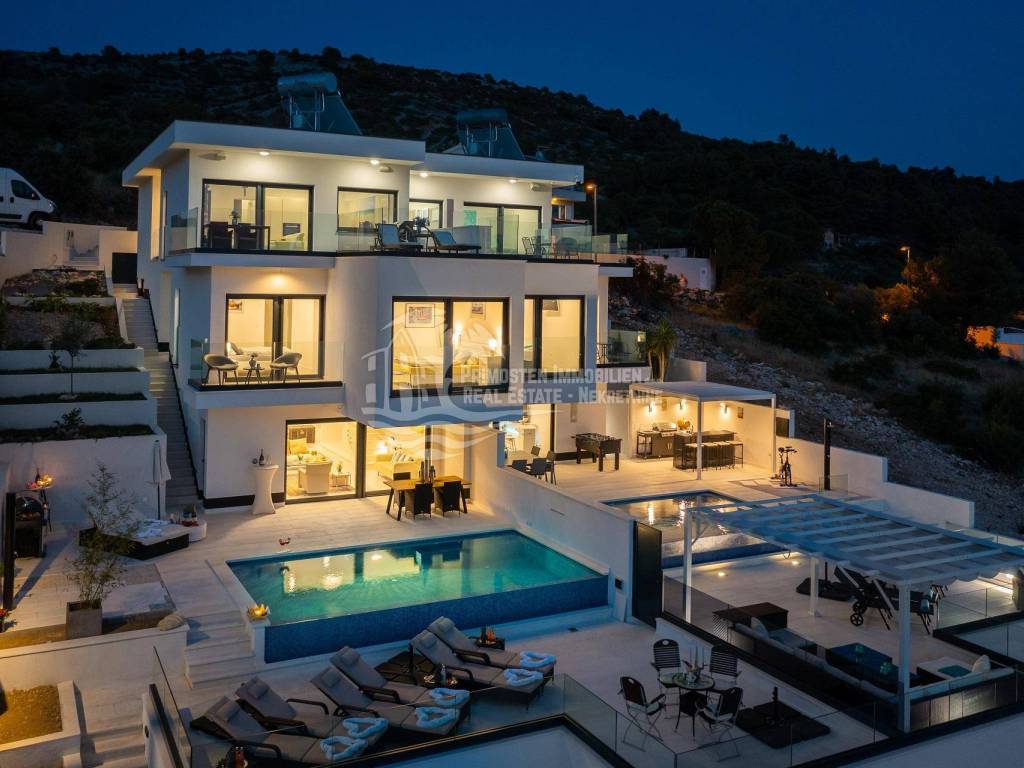 A villa near Rogoznica, a luxurious pearl of modern architecture. The house is part of a duplex complex (the left side of the picture refers to the building), has an area of 300 m², and was built on a plot of 488 m². Glazed and illuminated, modernly decorated with an elegant interior, the villa is an exclusive magnificent building. An impressive representative view of the bay and the illuminated city crown the location where the villa is located. The house consists of a souterrain, ground floor and two floors. On the ground floor there is a spacious living room with a kitchen and a dining room, and from the living room there is a spacious furnished terrace with a heated pool. On the ground floor there are also two additional storage rooms, a laundry room and a separate toilet. Floor heating is also fully installed on this floor. The staircase leads to the first floor, where there are three bedrooms with their own bathrooms. One bedroom has a separate area with a TV set and a couch set, as well as a separate access and an external staircase that can be used to get to that area. There is another laundry room on this floor. Both rooms have underfloor heating in the bathrooms. The rooms also have access to the terrace with a view of the sea. Furthermore, an internal staircase leads to the last floor, which serves as a separate residential unit and consists of a living room, kitchen, bedroom and bathroom. The living room leads to the outdoor terrace, which has a fantastic view of Rogoznica and the sea. There is also a fireplace in the living room. Also on the last floor, underfloor heating is installed in all rooms. All rooms have mosquito nets, electric blinds, and the villa is superbly equipped according to the latest standards. All rooms are air-conditioned, and the kitchens are equipped with top-quality appliances. In the complex there is a heated swimming pool measuring 7x4 with a heat pump, an outdoor grill with outdoor furniture, and a staircase leads to the souterrain, where there is a garage of approx. 20 m² with a boiler room. The facility has a total of five parking spaces. There are also solar collectors on the roof. The villa already has an established rental business and excellent seasonal occupancy. The location where the property is located is a charming little place next to Rogoznica that has seen significant tourist growth in the past few years. The villa is 100 m from the sea and 35 km from Split airport.